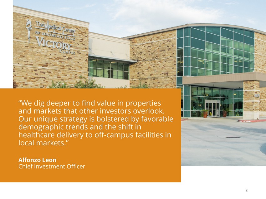 8 “We dig deeper to find value in properties and markets that other investors overlook. Our unique strategy is bolstered by favorable demographic trends and the shift in healthcare delivery to off - campus facilities in local markets.” Alfonzo Leon Chief Investment Officer