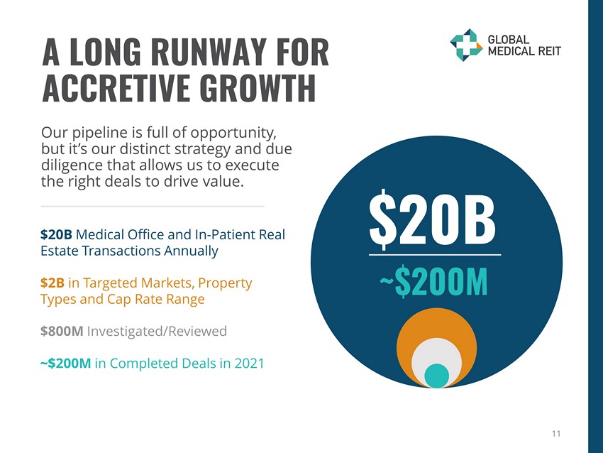 INVESTING IN THE FUTURE OF HEALTHCARE 10 90 % of Americans age 50 and older want to age in place. 1 65 % of seniors between the ages of 60 and 70 find it “very easy” to live independently. 2 As American’s choose to age in place, demand for conveniently located healthcare will continue to increase. 1) Source: WebMD 2) Source: aginginplace.org