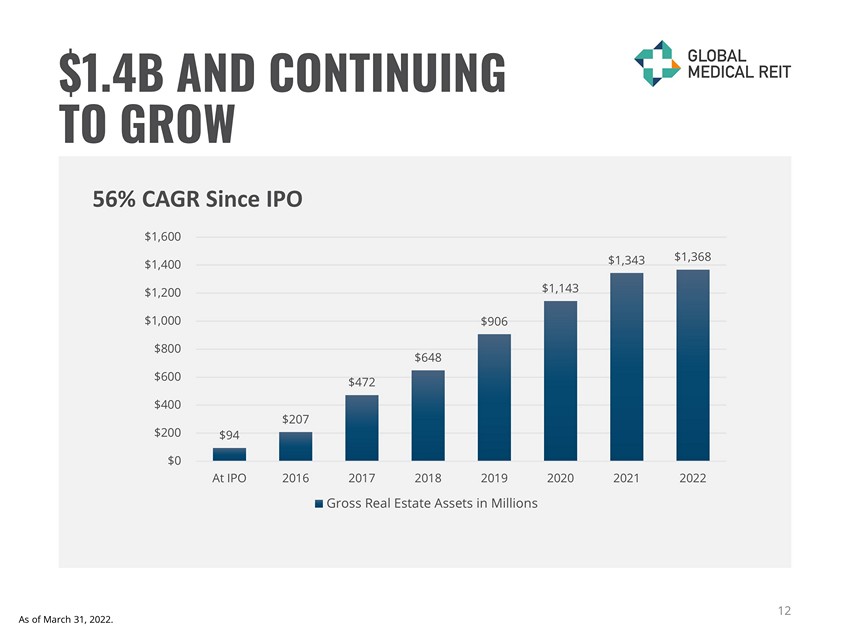 A LONG RUNWAY FOR ACCRETIVE GROWTH 11 $20B Medical Office and In - Patient Real Estate Transactions Annually $2B in Targeted Markets, Property Types and Cap Rate Range $800M Investigated/Reviewed ~$ 200M in Completed Deals in 2021 Our pipeline is full of opportunity, but it’s our distinct strategy and due diligence that allows us to execute the right deals to drive value. ~$200M $20B