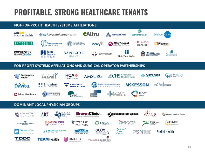 14 DOMINANT LOCAL PHYSICIAN GROUPS FOR - PROFIT SYSTEMS AFFILIATIONS AND SURGICAL OPERATOR PARTNERSHIPS PROFITABLE, STRONG HEALTHCARE TENANTS NOT - FOR - PROFIT HEALTH SYSTEMS AFFILIATIONS