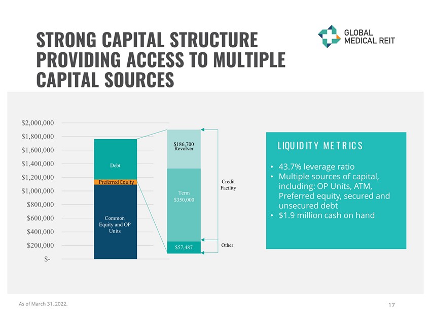 DISCLOSURES Rent Coverage Ratio For purposes of calculating our portfolio weighted - average EBITDARM coverage ratio (“Rent Coverage Ratio”), we excluded credit - rated tenants or their subsidiaries for which financial statements were either not available or not sufficiently detailed. Th ese ratios are based on latest available information only. Most tenant financial statements are unaudited and we have not independently verified any tenant financial information (audited or unaudited) and, therefore, we cannot assure you that such information i s accurate or complete. Certain other tenants (approximately 15% of our portfolio) are excluded from the calculation due to ( i ) lack of available financial information or (ii) receipt of significant COVID - 19 relief funds that may cause reported coverage to differ materially from underlying performance. Additionally, our Rent Coverage Ratio adds back physician distributions and compensation. Management believes all adjustments are reasonable and necessary. Additional Information The information in this document should be read in conjunction with the Company’s Annual Report on Form 10 - K, Quarterly Reports on Form 10 - Q, Current Reports on Form 8 - K, and other information filed with, or furnished to, the SEC. You can access the Compan y’s reports and amendments to those reports filed or furnished to the SEC pursuant to Section 13(a) or 15(d) of the Exchange Act in the “Investor Relations” section on the Company’s website ( www.globalmedicalreit.com ) under “SEC Filings” as soon as reasonably practicable after they are filed with, or furnished to, the SEC. The information on or connected to the Company’s website is not , and shall not be deemed to be, a part of, or incorporated into, this Earnings Supplemental. You also can review these SEC filings an d other information by accessing the SEC’s website at http:// www.sec.gov . Certain information contained in this package, including, but not limited to, information contained in our Top 10 tenant prof ile s is derived from publicly - available third - party sources. The Company has not independently verified this information and there can b e no assurance that such information is accurate or complete. 22