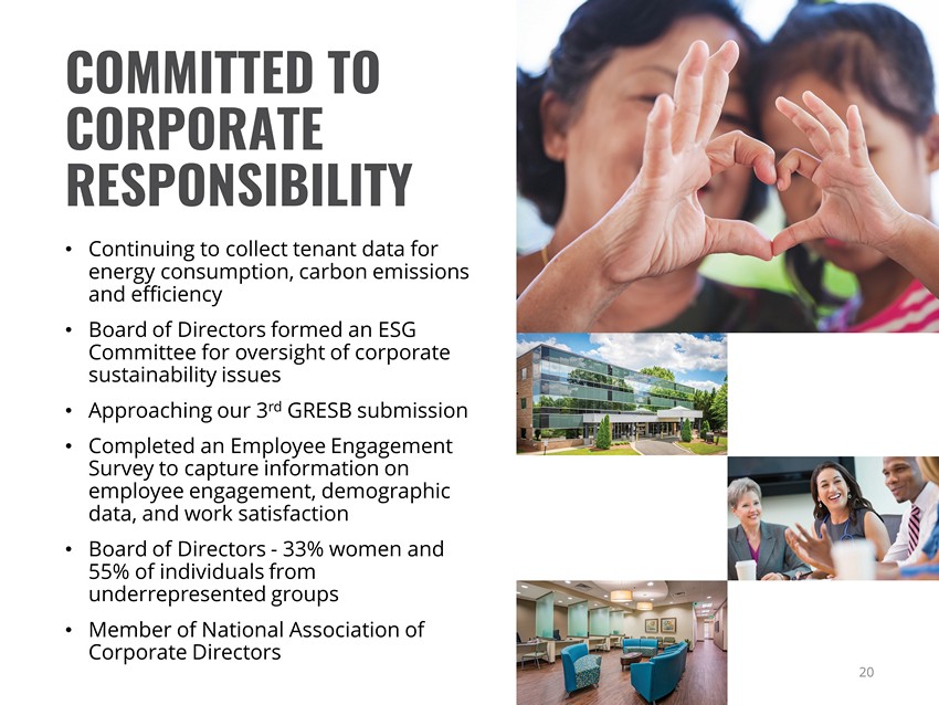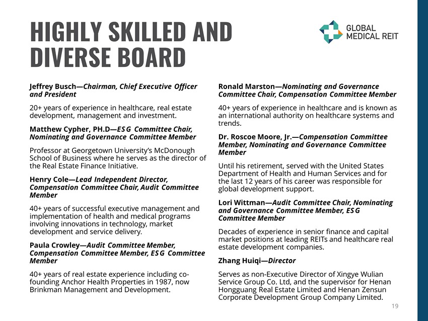 HIGHLY SKILLED AND DIVERSE BOARD Jeffrey Busch — Chairman, Chief Executive Officer and President 20+ years of experience in healthcare, real estate development, management and investment. Matthew Cypher, PH.D — ESG Committee Chair, Nominating and Governance Committee Member Professor at Georgetown University’s McDonough School of Business where he serves as the director of the Real Estate Finance Initiative. Henry Cole — Lead Independent Director, Compensation Committee Chair, Audit Committee Member 40+ years of successful executive management and implementation of health and medical programs involving innovations in technology, market development and service delivery. Paula Crowley — Audit Committee Member, Compensation Committee Member, ESG Committee Member 40+ years of real estate experience including co - founding Anchor Health Properties in 1987, now Brinkman Management and Development. Ronald Marston — Nominating and Governance Committee Chair, Compensation Committee Member 40+ years of experience in healthcare and is known as an international authority on healthcare systems and trends. Dr. Roscoe Moore, Jr. — Compensation Committee Member, Nominating and Governance Committee Member Until his retirement, served with the United States Department of Health and Human Services and for the last 12 years of his career was responsible for global development support. Lori Wittman — Audit Committee Chair, Nominating and Governance Committee Member, ESG Committee Member Decades of experience in senior finance and capital market positions at leading REITs and healthcare real estate development companies. Zhang Huiqi — Director Serves as non - Executive Director of Xingye Wulian Service Group Co. Ltd, and the supervisor for Henan Hongguang Real Estate Limited and Henan Zensun Corporate Development Group Company Limited. 19