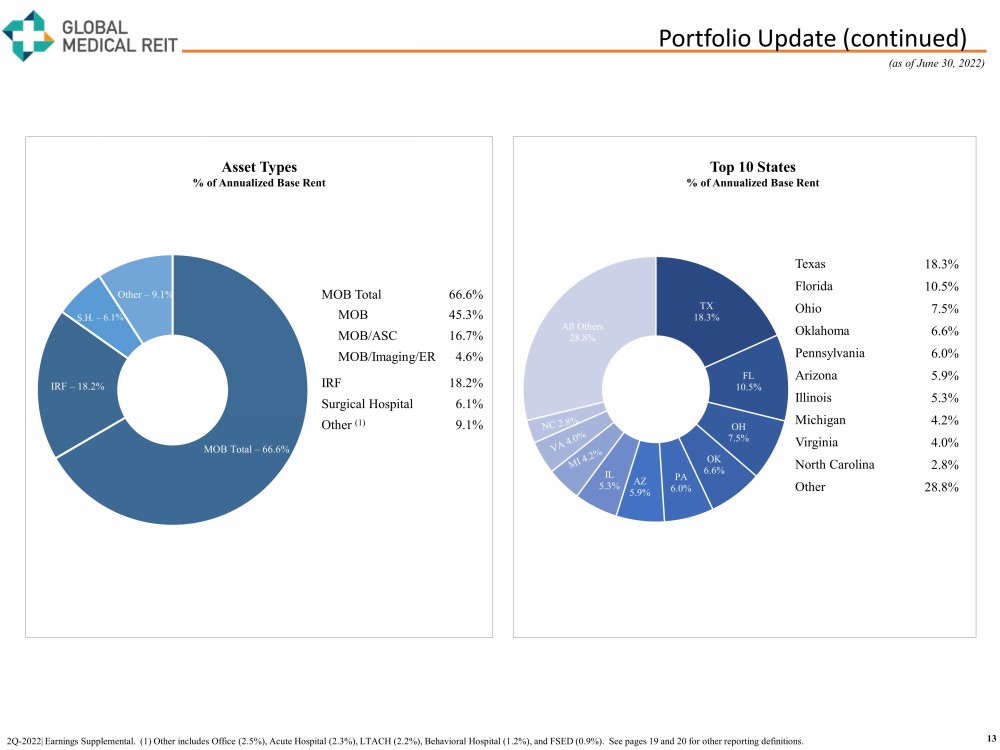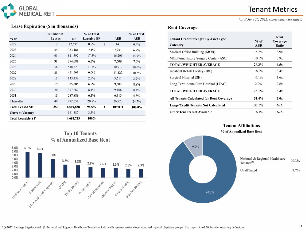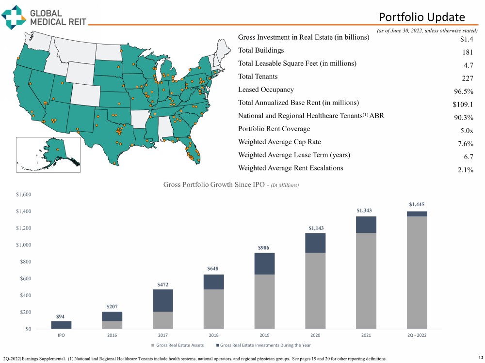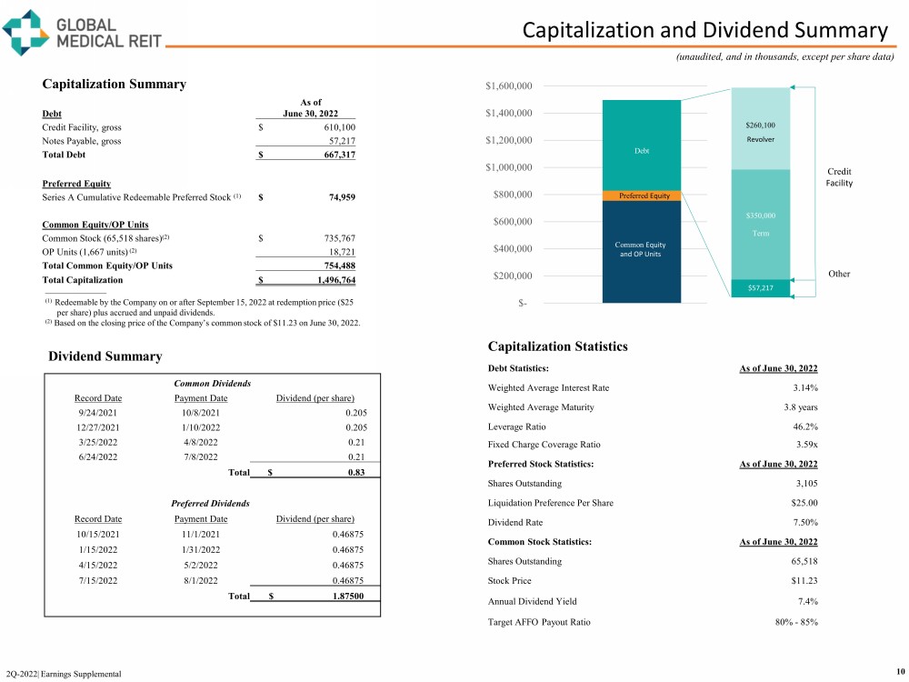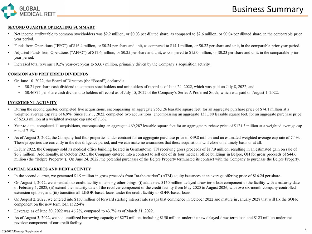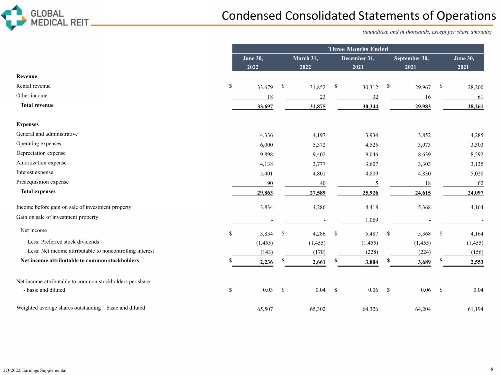 Second Quarter 2022 Earnings Supplemental Three and Six Months Ended June 30, 2022 www.globalmedicalreit.com NYSE: GMRE