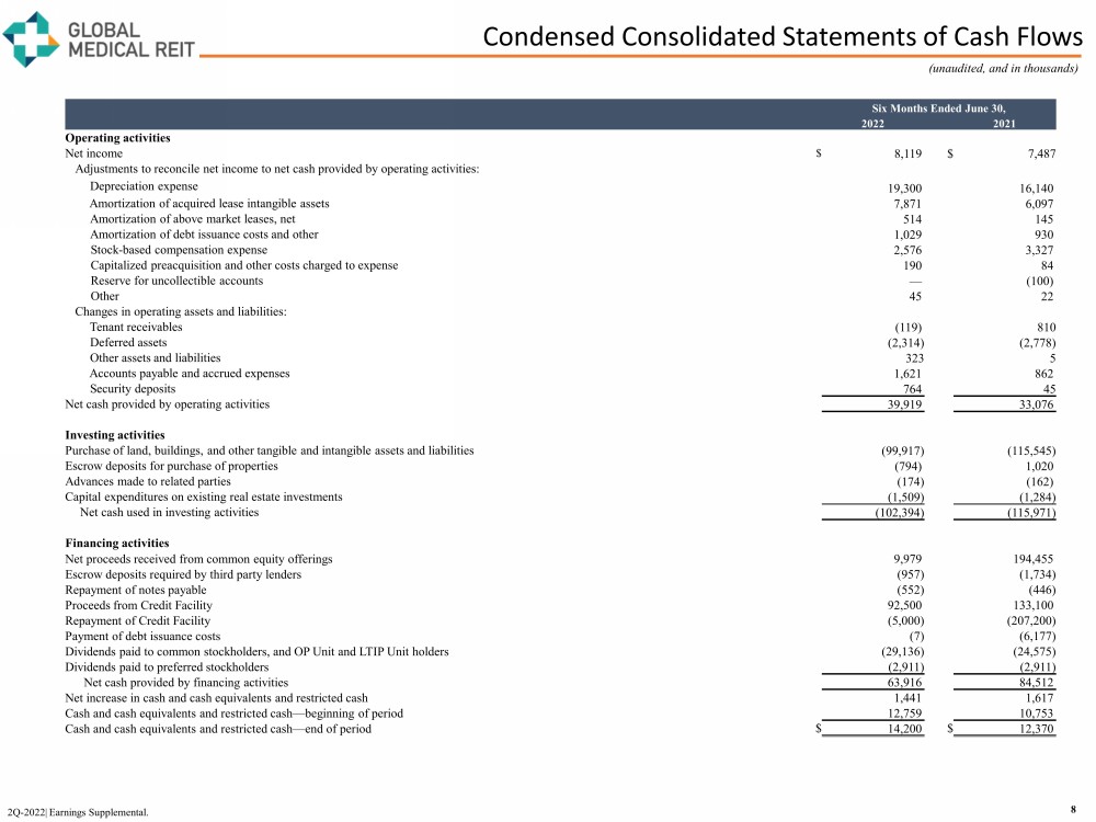 Condensed Consolidated Balance Sheets 7 2Q - 2022| Earnings Supplemental (unaudited, and in thousands) As of June 30, March 31, December 31, September 30, June 30, 2022 2022 2021 2021 2021 Assets Investment in real estate: Land $ 165,045 $ 155,529 $ 152,060 $ 149,249 $ 145,424 Building 1,049,876 1,002,087 985,091 964,169 931,510 Site improvements 20,805 19,596 19,021 18,017 17,011 Tenant improvements 62,500 60,154 58,900 56,156 53,730 Acquired lease intangible assets 146,339 130,790 127,931 123,918 112,649 1,444,565 1,368,156 1,343,003 1,311,509 1,260,324 Less: accumulated depreciation and amortization (172,006) (157,132) (143,255) (130,284) (117,720) Investment in real estate, net 1,272,559 1,211,024 1,199,748 1,181,225 1,142,604 Cash and cash equivalents 5,873 1,854 7,213 6,030 5,821 Restricted cash 8,327 6,336 5,546 5,839 6,549 Tenant receivables, net 6,189 6,477 6,070 5,126 4,886 Due from related parties 337 451 163 275 265 Escrow deposits 7,708 7,697 5,957 5,970 5,531 Deferred assets 27,731 26,714 25,417 24,422 23,050 Derivative asset 16,583 12,692 1,236 219 137 Goodwill 5,903 5,903 5,903 5,903 5,903 Other assets 6,056 6,345 6,232 8,297 5,219 Total assets $ 1,357,266 $ 1,285,493 $ 1,263,485 $ 1,243,306 $ 1,199,965 Liabilities and Equity Liabilities: Credit Facility, net $ 602,987 $ 529,130 $ 514,567 $ 497,203 $ 442,140 Notes payable, net 56,687 56,919 57,162 57,397 64,620 Accounts payable and accrued expenses 11,922 9,272 10,344 11,065 8,080 Dividends payable 15,926 15,823 15,668 15,309 15,251 Security deposits 5,304 4,616 4,540 4,600 4,385 Derivative liability — 1,865 7,790 12,070 13,814 Other liabilities 7,428 7,090 7,709 7,104 5,983 Acquired lease intangible liability, net 7,903 8,161 8,128 8,333 8,437 Total liabilities 708,157 632,876 625,908 613,081 562,710 Equity: Preferred stock ($77,625 liquidation preference) 74,959 74,959 74,959 74,959 74,959 Common stock 66 65 65 64 64 Additional paid - in capital 722,074 720,306 711,414 700,206 700,038 Accumulated deficit (179,614) (168,089) (157,017) (147,562) (138,088) Accumulated other comprehensive income (loss) 16,527 10,757 (6,636) (11,946) (13,784) Total Global Medical REIT Inc. stockholders' equity 634,012 637,998 622,785 615,721 623,189 Noncontrolling interest 15,097 14,619 14,792 14,504 14,066 Total equity 649,109 652,617 637,577 630,225 637,255 Total liabilities and equity $ 1,357,266 $ 1,285,493 $ 1,263,485 $ 1,243,306 $ 1,199,965