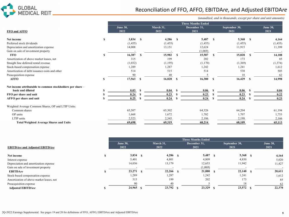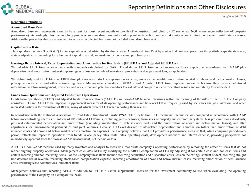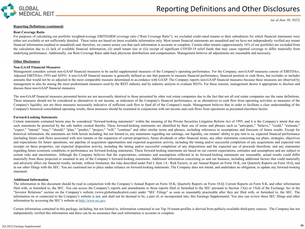 Reporting Definitions and Other Disclosures Reporting Definitions (continued) Rent Coverage Ratio For purposes of calculating our portfolio weighted - average EBITDARM coverage ratio (“Rent Coverage Ratio”), we excluded credit - rated tenants or their subsidiaries for which financial statements were either not available or not sufficiently detailed . These ratios are based on latest available information only . Most tenant financial statements are unaudited and we have not independently verified any tenant financial information (audited or unaudited) and, therefore, we cannot assure you that such information is accurate or complete . Certain other tenants (approximately 16 % of our portfolio) are excluded from the calculation due to (i) lack of available financial information, (ii) small tenant size or (iii) receipt of significant COVID - 19 relief funds that may cause reported coverage to differ materially from underlying performance . Additionally, our Rent Coverage Ratio adds back physician distributions and compensation . Management believes all adjustments are reasonable and necessary . Other Disclosures Non - GAAP Financial Measures Management considers certain non - GAAP financial measures to be useful supplemental measures of the Company's operating performance . For the Company, non - GAAP measures consist of EBITDA re , Adjusted EBITDA re , FFO and AFFO . A non - GAAP financial measure is generally defined as one that purports to measure financial performance, financial position or cash flows, but excludes or includes amounts that would not be so adjusted in the most comparable measure determined in accordance with GAAP . The Company reports non - GAAP financial measures because these measures are observed by management to also be among the most predominant measures used by the REIT industry and by industry analysts to evaluate REITs . For these reasons, management deems it appropriate to disclose and discuss these non - GAAP financial measures . The non - GAAP financial measures presented herein are not necessarily identical to those presented by other real estate companies due to the fact that not all real estate companies use the same definitions . These measures should not be considered as alternatives to net income, as indicators of the Company's financial performance, or as alternatives to cash flow from operating activities as measures of the Company's liquidity, nor are these measures necessarily indicative of sufficient cash flow to fund all of the Company's needs . Management believes that in order to facilitate a clear understanding of the Company's historical consolidated operating results, these measures should be examined in conjunction with net income and cash flows from operations as presented elsewhere herein . Forward - Looking Statements Certain statements contained herein may be considered “forward - looking statements” within the meaning of the Private Securities Litigation Reform Act of 1995 , and it is the Company’s intent that any such statements be protected by the safe harbor created thereby . These forward - looking statements are identified by their use of terms and phrases such as "anticipate," "believe," "could," "estimate," "expect," "intend," "may," "should," "plan," "predict," "project," "will," "continue" and other similar terms and phrases, including references to assumptions and forecasts of future results . Except for historical information, the statements set forth herein including, but not limited to, any statements regarding our earnings, our liquidity, our tenants’ ability to pay rent to us, expected financial performance (including future cash flows associated with new tenants or the expansion of current properties), future dividends or other financial items ; any other statements concerning our plans, strategies, objectives and expectations for future operations, our pipeline of acquisition opportunities and expected acquisition activity, including the timing and/or successful completion of any acquisitions and expected rent receipts on these properties, our expected disposition activity, including the timing and/or successful completion of any dispositions and the expected use of proceeds therefrom, and any statements regarding future economic conditions or performance are forward - looking statements . These forward - looking statements are based on our current expectations, estimates and assumptions and are subject to certain risks and uncertainties . Although the Company believes that the expectations, estimates and assumptions reflected in its forward - looking statements are reasonable, actual results could differ materially from those projected or assumed in any of the Company’s forward - looking statements . Additional information concerning us and our business, including additional factors that could materially and adversely affect our financial results, include, without limitation, the risks described under Part I, Item 1 A - Risk Factors, in our Annual Report on Form 10 - K, our Quarterly Reports on Form 10 - Q, and in our other filings with the SEC . You are cautioned not to place undue reliance on forward - looking statements . The Company does not intend, and undertakes no obligation, to update any forward - looking statement . Additional Information The information in this document should be read in conjunction with the Company’s Annual Report on Form 10 - K, Quarterly Reports on Form 10 - Q, Current Reports on Form 8 - K, and other information filed with, or furnished to, the SEC . You can access the Company’s reports and amendments to those reports filed or furnished to the SEC pursuant to Section 13 (a) or 15 (d) of the Exchange Act in the “Investor Relations” section on the Company’s website (www . globalmedicalreit . com) under “SEC Filings” as soon as reasonably practicable after they are filed with, or furnished to, the SEC . The information on or connected to the Company’s website is