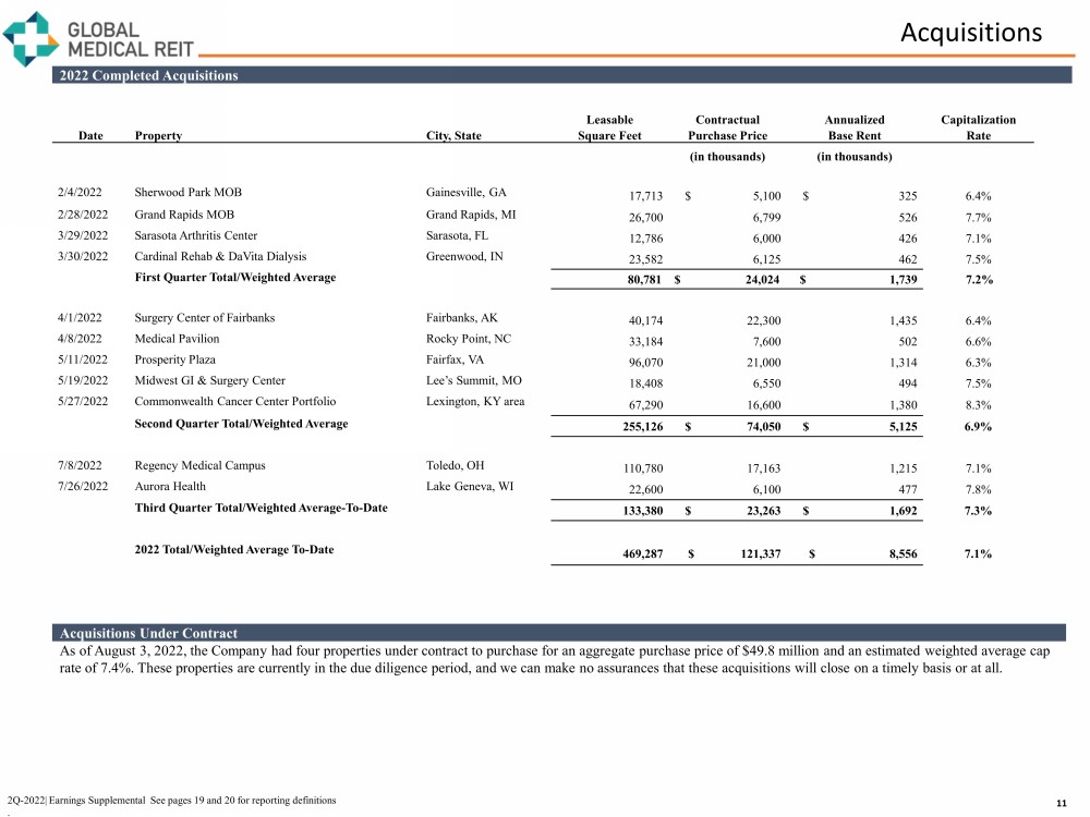 Acquisitions 11 2022 Completed Acquisitions Acquisitions Under Contract As of August 3, 2022, the Company had four properties under contract to purchase for an aggregate purchase price of $49.8 mil lio n and an estimated weighted average cap rate of 7.4%. These properties are currently in the due diligence period, and we can make no assurances that these acquisitio ns will close on a timely basis or at all. 2Q - 2022| Earnings Supplemental See pages 19 and 20 for reporting definitions . Date Property City, State Leasable Square Feet Contractual Purchase Price Annualized Base Rent Capitalization Rate (in thousands) (in thousands) 2/4/2022 Sherwood Park MOB Gainesville, GA 17,713 $ 5,100 $ 325 6.4% 2/28/2022 Grand Rapids MOB Grand Rapids, MI 26,700 6,799 526 7.7% 3/29/2022 Sarasota Arthritis Center Sarasota, FL 12,786 6,000 426 7.1% 3/30/2022 Cardinal Rehab & DaVita Dialysis Greenwood, IN 23,582 6,125 462 7.5% First Quarter Total/Weighted Average 80,781 $ 24,024 $ 1,739 7.2% 4/1/2022 Surgery Center of Fairbanks Fairbanks, AK 40,174 22,300 1,435 6.4% 4/8/2022 Medical Pavilion Rocky Point, NC 33,184 7,600 502 6.6% 5/11/2022 Prosperity Plaza Fairfax, VA 96,070 21,000 1,314 6.3% 5/19/2022 Midwest GI & Surgery Center Lee’s Summit, MO 18,408 6,550 494 7.5% 5/27/2022 Commonwealth Cancer Center Portfolio Lexington, KY area 67,290 16,600 1,380 8.3% Second Quarter Total/Weighted Average 255,126 $ 74,050 $ 5,125 6.9% 7/8/2022 Regency Medical Campus Toledo, OH 110,780 17,163 1,215 7.1% 7/26/2022 Aurora Health Lake Geneva, WI 22,600 6,100 477 7.8% Third Quarter Total/Weighted Average - To - Date 133,380 $ 23,263 $ 1,692 7.3% 2022 Total/Weighted Average To - Date 469,287 $ 121,337 $ 8,556 7.1%