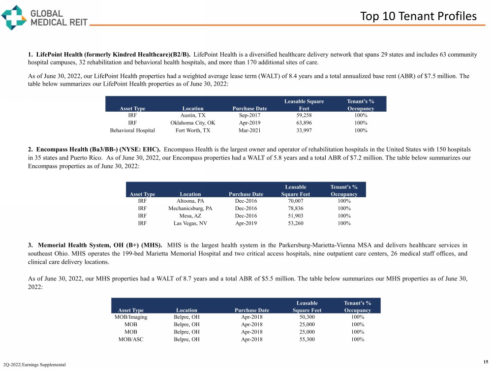 Top 10 Tenant Profiles 15 2Q - 2022| Earnings Supplemental 1. LifePoint Health (formerly Kindred Healthcare)(B2/B). LifePoint Health is a diversified healthcare delivery network that spans 29 states and includes 63 community hospital campuses, 32 rehabilitation and behavioral health hospitals, and more than 170 additional sites of care. As of June 30, 2022, our LifePoint Health properties had a weighted average lease term (WALT) of 8.4 years and a total annual ize d base rent (ABR) of $7.5 million. The table below summarizes our LifePoint Health properties as of June 30, 2022: 2 . Encompass Health (Ba 3 /BB - ) (NYSE : EHC) . Encompass Health is the largest owner and operator of rehabilitation hospitals in the United States with 150 hospitals in 35 states and Puerto Rico . As of June 30 , 2022 , our Encompass properties had a WALT of 5 . 8 years and a total ABR of $ 7 . 2 million . The table below summarizes our Encompass properties as of June 30 , 2022 : 3 . Memorial Health System, OH (B+) (MHS) . MHS is the largest health system in the Parkersburg - Marietta - Vienna MSA and delivers healthcare services in southeast Ohio . MHS operates the 199 - bed Marietta Memorial Hospital and two critical access hospitals, nine outpatient care centers, 26 medical staff offices, and clinical care delivery locations . As of June 30 , 2022 , our MHS properties had a WALT of 8 . 7 years and a total ABR of $ 5 . 5 million . The table below summarizes our MHS properties as of June 30 , 2022 : Asset Type Location Purchase Date Leasable Square Feet Tenant’s % Occupancy IRF Austin, TX Sep - 2017 59,258 100% IRF Oklahoma City, OK Apr - 2019 63,896 100% Behavioral Hospital Fort Worth, TX Mar - 2021 33,997 100% Asset Type Location Purchase Date Leasable Square Feet Tenant’s % Occupancy IRF Altoona, PA Dec - 2016 70,007 100% IRF Mechanicsburg, PA Dec - 2016 78,836 100% IRF Mesa, AZ Dec - 2016 51,903 100% IRF Las Vegas, NV Apr - 2019 53,260 100% Asset Type Location Purchase Date Leasable Square Feet Tenant’s % Occupancy MOB/Imaging Belpre, OH Apr - 2018 50,300 100% MOB Belpre, OH Apr - 2018 25,000 100% MOB Belpre, OH Apr - 2018 25,000 100% MOB/ASC Belpre, OH Apr - 2018 55,300 100%