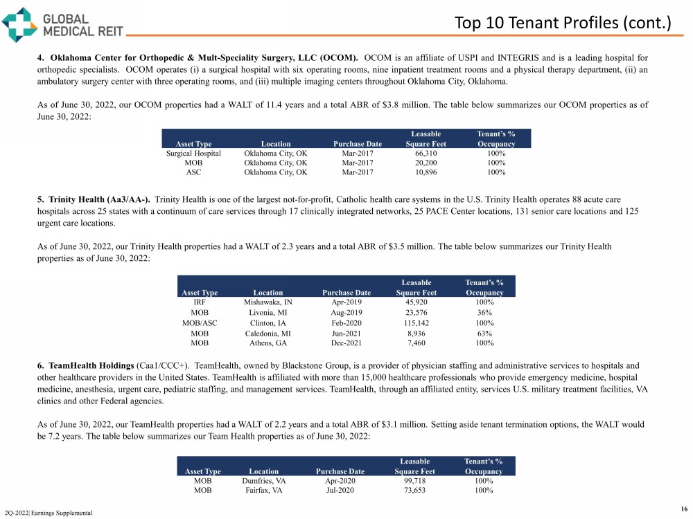 5. Trinity Health (Aa3/AA - ). Trinity Health is one of the largest not - for - profit, Catholic health care systems in the U.S. Trinity Health operates 88 acute c are hospitals across 25 states with a continuum of care services through 17 clinically i ntegrated n etworks, 25 PACE Center locations, 131 senior c are locations and 125 urgent c are locations. As of June 30, 2022, our Trinity Health properties had a WALT of 2.3 years and a total ABR of $3.5 million . The table below summarizes our Trinity Health properties as of June 30, 2022: Top 10 Tenant Profiles (cont.) 6. TeamHealth Holdings (Caa1/CCC+). TeamHealth, owned by Blackstone Group, is a provider of physician staffing and administrative services to hospitals and other healthcare providers in the United States. TeamHealth is affiliated with more than 15,000 healthcare professionals who pro vide emergency medicine, hospital medicine, anesthesia, urgent care, pediatric staffing, and management services. TeamHealth, through an affiliated entity, ser vic es U.S. military treatment facilities, VA clinics and other Federal agencies. As of June 30, 2022, our TeamHealth properties had a WALT of 2.2 years and a total ABR of $3.1 million . Setting aside tenant termination options, the WALT would be 7.2 years. The table below summarizes our Team Health properties as of June 30, 2022: 2Q - 2022| Earnings Supplemental 16 4 . Oklahoma Center for Orthopedic & Mult - Speciality Surgery, LLC (OCOM) . OCOM is an affiliate of USPI and INTEGRIS and is a leading hospital for orthopedic specialists . OCOM operates (i) a surgical hospital with six operating rooms, nine inpatient treatment rooms and a physical therapy department, (ii) an ambulatory surgery center with three operating rooms, and (iii) multiple imaging centers throughout Oklahoma City, Oklahoma . As of June 30 , 2022 , our OCOM properties had a WALT of 11 . 4 years and a total ABR of $ 3 . 8 million . The table below summarizes our OCOM properties as of June 30 , 2022 : Asset Type Location Purchase Date Leasable Square Feet Tenant’s % Occupancy Surgical Hospital Oklahoma City, OK Mar - 2017 66,310 100% MOB Oklahoma City, OK Mar - 2017 20,200 100% ASC Oklahoma City, OK Mar - 2017 10,896 100% Asset Type Location Purchase Date Leasable Square Feet Tenant’s % Occupancy IRF Mishawaka, IN Apr - 2019 45,920 100% MOB Livonia, MI Aug - 2019 23,576 36% MOB/ASC Clinton, IA Feb - 2020 115,142 100% MOB Caledonia, MI Jun - 2021 8,936 63% MOB Athens, GA Dec - 2021 7,460 100% Asset Type Location Purchase Date Leasable Square Feet Tenant’s % Occupancy MOB Dumfries, VA Apr - 2020 99,718 100% MOB Fairfax, VA Jul - 2020 73,653 100%