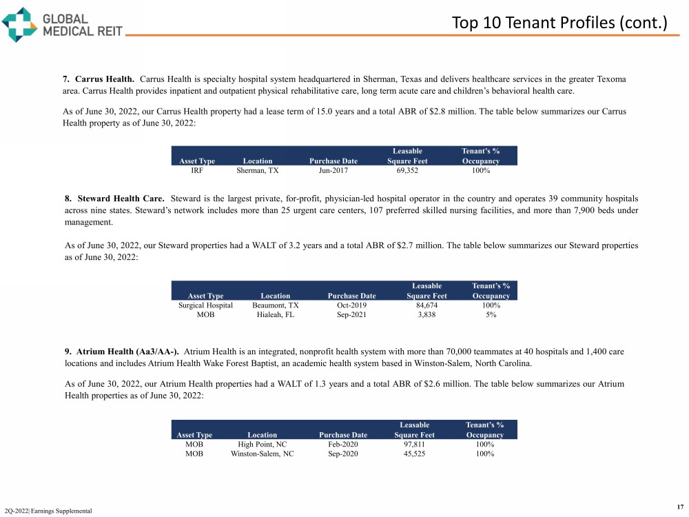 8 . Steward Health Care . Steward is the largest private, for - profit , physician - led hospital operator in the country and operates 39 community hospitals across nine states . Steward’s network includes more than 25 urgent c are c enters, 107 preferred skilled nursing facilities, and more than 7 , 900 beds under management . A s of June 30 , 2022 , our Steward properties had a WALT of 3 . 2 years and a total ABR of $ 2 . 7 million . The table below summarizes our Steward properties as of June 30 , 2022 : 9 . Atrium Health (Aa 3 /AA - ) . Atrium Health is an integrated, nonprofit health system with more than 70 , 000 teammates at 40 hospitals and 1 , 400 care locations and includes Atrium Health Wake Forest Baptist, an academic health system based in Winston - Salem, North Carolina . As of June 30 , 2022 , our Atrium Health properties had a WALT of 1 . 3 years and a total ABR of $ 2 . 6 million . The table below summarizes our Atrium Health properties as of June 30 , 2022 : Top 10 Tenant Profiles (cont.) 2Q - 2022| Earnings Supplemental 17 7 . Carrus Health . Carrus Health is specialty hospital system headquartered in Sherman, Texas and delivers healthcare services in the greater Texoma area . Carrus Health provides inpatient and outpatient physical rehabilitative care, long term acute care and children’s behavioral health care . As of June 30 , 2022 , our Carrus Health property had a lease term of 15 . 0 years and a total ABR of $ 2 . 8 million . The table below summarizes our Carrus Health property as of June 30 , 2022 : Asset Type Location Purchase Date Leasable Square Feet Tenant’s % Occupancy IRF Sherman, TX Jun - 2017 69,352 100% Asset Type Location Purchase Date Leasable Square Feet Tenant’s % Occupancy Surgical Hospital Beaumont, TX Oct - 2019 84,674 100% MOB Hialeah, FL Sep - 2021 3,838 5% Asset Type Location Purchase Date Leasable Square Feet Tenant’s % Occupancy MOB High Point, NC Feb - 2020 97,811 100% MOB Winston - Salem, NC Sep - 2020 45,525 100%