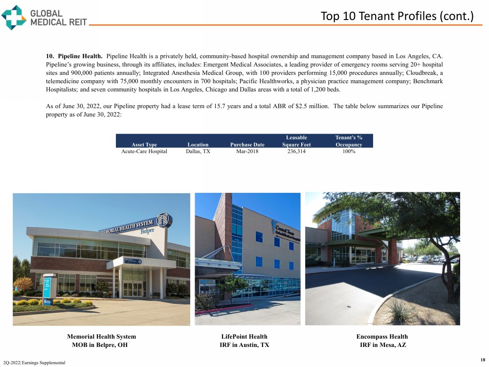 10 . Pipeline Health . Pipeline Health is a privately held, community-based hospital ownership and management company based in Los Angeles, CA . Pipeline’s growing business, through its affiliates, includes : Emergent Medical Associates, a leading provider of emergency rooms serving 20 + hospital sites and 900 , 000 patients annually ; Integrated Anesthesia Medical Group, with 100 providers performing 15 , 000 procedures annually ; Cloudbreak , a telemedicine company with 75 , 000 monthly encounters in 700 hospitals ; Pacific Healthworks, a physician practice management company ; Benchmark Hospitalists ; and seven community hospitals in Los Angeles, Chicago and Dallas areas with a total of 1 , 200 beds . As of June 30 , 2022 , our Pipeline property had a lease term of 15 . 7 years and a total ABR of $ 2 . 5 million . The table below summarizes our Pipeline property as of June 30 , 2022 : Top 10 Tenant Profiles (cont.) 18 2Q - 2022| Earnings Supplemental Asset Type Location Purchase Date Leasable Square Feet Tenant’s % Occupancy Acute - Care Hospital Dallas, TX Mar - 2018 236,314 100% Memorial Health System LifePoint Health Encompass Health MOB in Belpre, OH IRF in Austin, TX IRF in Mesa, AZ