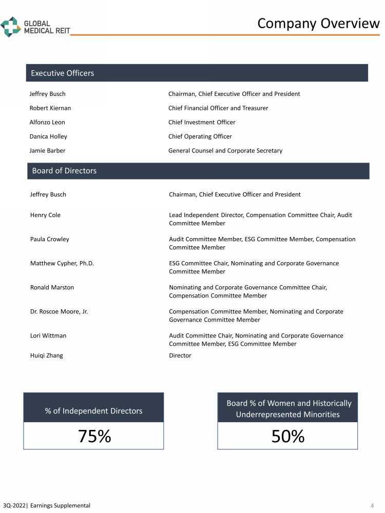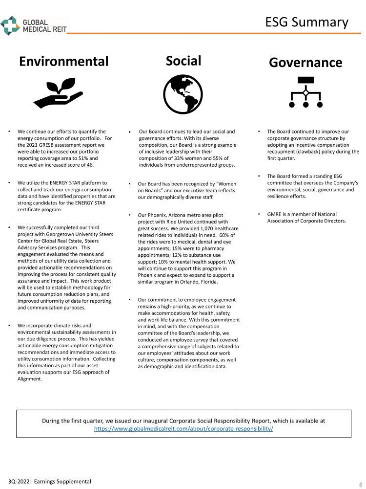 Environmental Social Governance During the first quarter, we issued our inaugural Corporate Social Responsibility Report, which is available at https://www.globalmedicalreit.com/about/corporate - responsibility/ ESG Summary 8 3Q - 2022| Earnings Supplemental • We continue our efforts to quantify the energy consumption of our portfolio. For the 2021 GRESB assessment report we were able to increased our portfolio reporting coverage area to 51% and received an increased score of 46. • We utilize the ENERGY STAR platform to collect and track our energy consumption data and have identified properties that are strong candidates for the ENERGY STAR certificate program. • We successfully completed our third project with Georgetown University Steers Center for Global Real Estate, Steers Advisory Services program. This engagement evaluated the means and methods of our utility data collection and provided actionable recommendations on improving the process for consistent quality assurance and impact. This work product will be used to establish methodology for future consumption reduction plans, and improved uniformity of data for reporting and communication purposes. • We incorporate climate risks and environmental sustainability assessments in our due diligence process. This has yielded actionable energy consumption mitigation recommendations and immediate access to utility consumption information. Collecting this information as part of our asset evaluation supports our ESG approach of Alignment. Our Board continues to lead our social and governance efforts. With its diverse composition, our Board is a strong example of inclusive leadership with their composition of 33% women and 55% of individuals from underrepresented groups. • Our Board has been recognized by “Women on Boards” and our executive team reflects our demographically diverse staff. • Our Phoenix, Arizona metro area pilot project with Ride United continued with great success. We provided 1,070 healthcare related rides to individuals in need. 60% of the rides were to medical, dental and eye appointments; 15% were to pharmacy appointments; 12% to substance use support; 10% to mental health support. We will continue to support this program in Phoenix and expect to expand to support a similar program in Orlando, Florida. • Our commitment to employee engagement remains a high - priority, as we continue to make accommodations for health, safety, and work - life balance. With this commitment in mind, and with the compensation committee of the Board’s leadership, we conducted an employee survey that covered a comprehensive range of subjects related to our employees’ attitudes about our work culture, compensation components, as well as demographic and identification data. • The Board continued to improve our corporate governance structure by adopting an incentive compensation recoupment ( clawback ) policy during the first quarter. • The Board formed a standing ESG committee that oversees the Company’s environmental, social, governance and resilience efforts. • GMRE is a member of National Association of Corporate Directors.