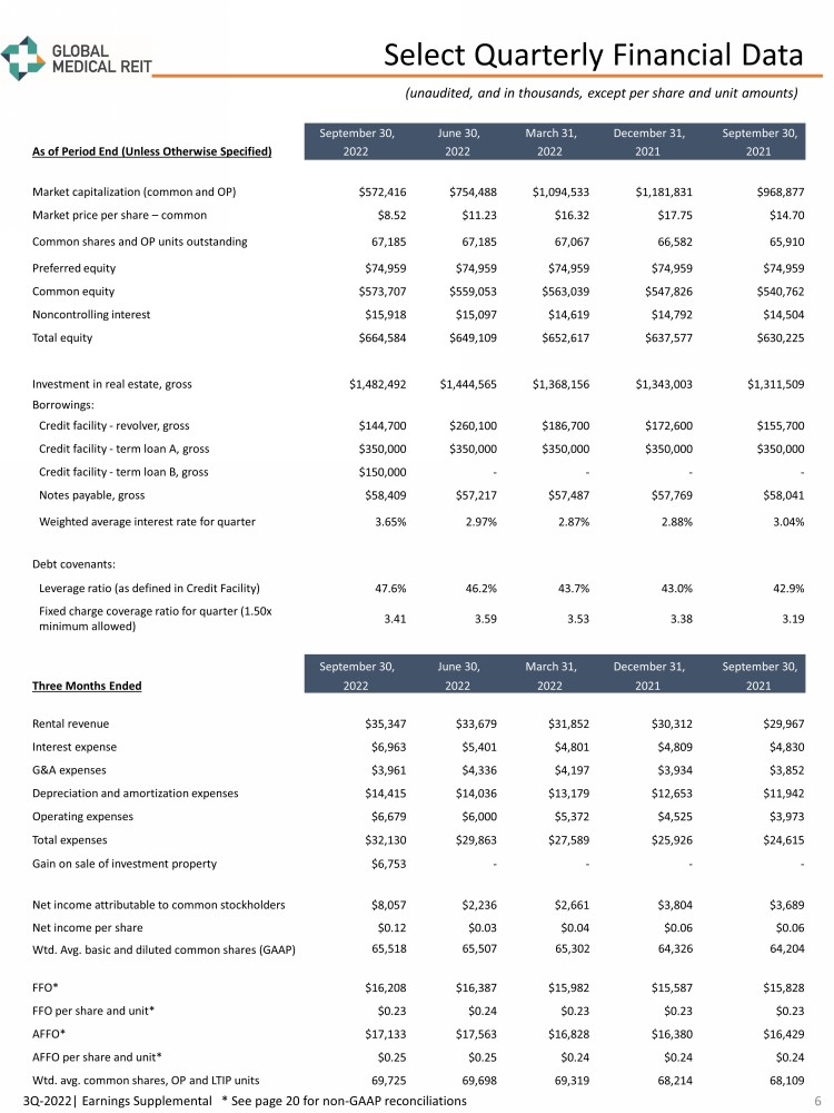 (unaudited, and in thousands, except per share and unit amounts) 3Q - 2022| Earnings Supplemental * See page 20 for non - GAAP reconciliations September 30, June 30, March 31, December 31, September 30, As of Period End (Unless Otherwise Specified) 2022 2022 2022 2021 2021 Market capitalization (common and OP) $572,416 $754,488 $1,094,533 $1,181,831 $968,877 Market price per share – common $8.52 $11.23 $16.32 $17.75 $14.70 Common shares and OP units outstanding 67,185 67,185 67,067 66,582 65,910 Preferred equity $74,959 $74,959 $74,959 $74,959 $74,959 Common equity $573,707 $559,053 $563,039 $547,826 $540,762 Noncontrolling interest $15,918 $15,097 $14,619 $14,792 $14,504 Total equity $664,584 $649,109 $652,617 $637,577 $630,225 Investment in real estate, gross $1,482,492 $1,444,565 $1,368,156 $1,343,003 $1,311,509 Borrowings: Credit facility - revolver, gross $144,700 $260,100 $186,700 $172,600 $155,700 Credit facility - term loan A, gross $350,000 $350,000 $350,000 $350,000 $350,000 Credit facility - term loan B, gross $150,000 - - - - Notes payable, gross $58,409 $57,217 $57,487 $57,769 $58,041 Weighted average interest rate for quarter 3.65% 2.97% 2.87% 2.88% 3.04% Debt covenants: Leverage ratio (as defined in Credit Facility) 47.6% 46.2% 43.7% 43.0% 42.9% Fixed charge coverage ratio for quarter (1.50x minimum allowed) 3.41 3.59 3.53 3.38 3.19 September 30, June 30, March 31, December 31, September 30, Three Months Ended 2022 2022 2022 2021 2021 Rental revenue $35,347 $33,679 $31,852 $30,312 $29,967 Interest expense $6,963 $5,401 $4,801 $4,809 $4,830 G&A expenses $3,961 $4,336 $4,197 $3,934 $3,852 Depreciation and amortization expenses $14,415 $14,036 $13,179 $12,653 $11,942 Operating expenses $6,679 $6,000 $5,372 $4,525 $3,973 Total expenses $32,130 $29,863 $27,589 $25,926 $24,615 Gain on sale of investment property $6,753 - - - - Net income attributable to common stockholders $8,057 $2,236 $2,661 $3,804 $3,689 Net income per share $0.12 $0.03 $0.04 $0.06 $0.06 Wtd . Avg. basic and diluted common shares (GAAP) 65,518 65,507 65,302 64,326 64,204 FFO* $16,208 $16,387 $15,982 $15,587 $15,828 FFO per share and unit* $0.23 $0.24 $0.23 $0.23 $0.23 AFFO* $17,133 $17,563 $16,828 $16,380 $16,429 AFFO per share and unit* $0.25 $0.25 $0.24 $0.24 $0.24 Wtd . avg. common shares, OP and LTIP units 69,725 69,698 69,319 68,214 68,109 Select Quarterly Financial Data 6