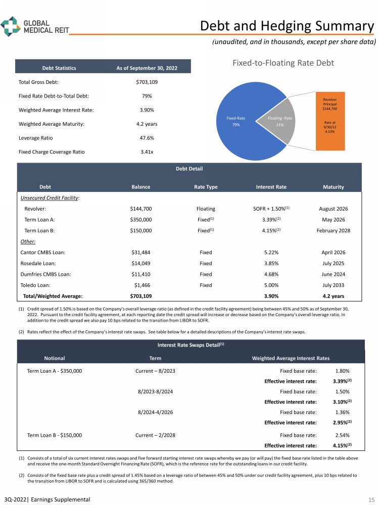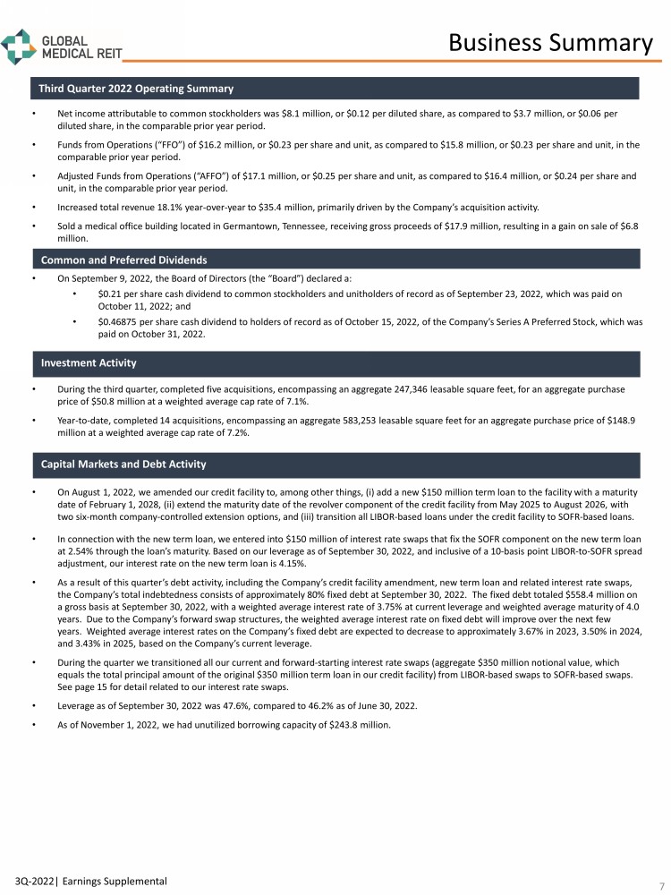 3Q - 2022| Earnings Supplemental • Net income attributable to common stockholders was $8.1 million, or $0.12 per diluted share, as compared to $3.7 million, or $0. 06 per diluted share, in the comparable prior year period. • Funds from Operations (“FFO”) of $16.2 million, or $0.23 per share and unit, as compared to $15.8 million, or $0.23 per share an d unit, in the comparable prior year period. • Adjusted Funds from Operations (“AFFO”) of $17.1 million, or $0.25 per share and unit, as compared to $16.4 million, or $0.24 pe r share and unit, in the comparable prior year period. • Increased total revenue 18.1% year - over - year to $35.4 million, primarily driven by the Company’s acquisition activity. • Sold a medical office building located in Germantown, Tennessee, receiving gross proceeds of $17.9 million, resulting in a ga in on sale of $6.8 million. • On September 9, 2022, the Board of Directors (the “Board”) declared a: • $0.21 per share cash dividend to common stockholders and unitholders of record as of September 23, 2022, which was paid on October 11, 2022; and • $0.46875 per share cash dividend to holders of record as of October 15, 2022, of the Company’s Series A Preferred Stock, whic h w as paid on October 31, 2022. • During the third quarter, completed five acquisitions, encompassing an aggregate 247,346 leasable square feet, for an aggrega te purchase price of $50.8 million at a weighted average cap rate of 7.1%. • Year - to - date, completed 14 acquisitions, encompassing an aggregate 583,253 leasable square feet for an aggregate purchase price of $148.9 million at a weighted average cap rate of 7.2%. • On August 1, 2022, we amended our credit facility to, among other things, (i) add a new $150 million term loan to the facility with a maturity date of February 1, 2028, (ii) extend the maturity date of the revolver component of the credit facility from May 2025 to Aug ust 2026, with two six - month company - controlled extension options, and (iii) transition all LIBOR - based loans under the credit facility to SOFR - based loans. • In connection with the new term loan, we entered into $150 million of interest rate swaps that fix the SOFR component on the new term loan at 2.54% through the loan’s maturity. Based on our leverage as of September 30, 2022, and inclusive of a 10 - basis point LIBOR - to - SOFR spread adjustment, our interest rate on the new term loan is 4.15%. • As a result of this quarter’s debt activity, including the Company’s credit facility amendment, new term loan and related int ere st rate swaps, the Company’s total indebtedness consists of approximately 80% fixed debt at September 30, 2022. The fixed debt totaled $558.4 million on a gross basis at September 30, 2022, with a weighted average interest rate of 3.75% at current leverage and weighted average mat urity of 4.0 years. Due to the Company’s forward swap structures, the weighted average interest rate on fixed debt will improve over the nex t few years. Weighted average interest rates on the Company’s fixed debt are expected to decrease to approximately 3.67% in 2023, 3.5 0% in 2024, and 3.43% in 2025, based on the Company’s current leverage. • During the quarter we transitioned all our current and forward - starting interest rate swaps (aggregate $350 million notional val ue, which equals the total principal amount of the original $350 million term loan in our credit facility) from LIBOR - based swaps to SOFR - based swaps. See page 15 for detail related to our interest rate swaps. • Leverage as of September 30, 2022 was 47.6%, compared to 46.2% as of June 30, 2022. • As of November 1, 2022, we had unutilized borrowing capacity of $243.8 million. Third Quarter 2022 Operating Summary Common and Preferred Dividends Investment Activity Capital Markets and Debt Activity Business Summary 7