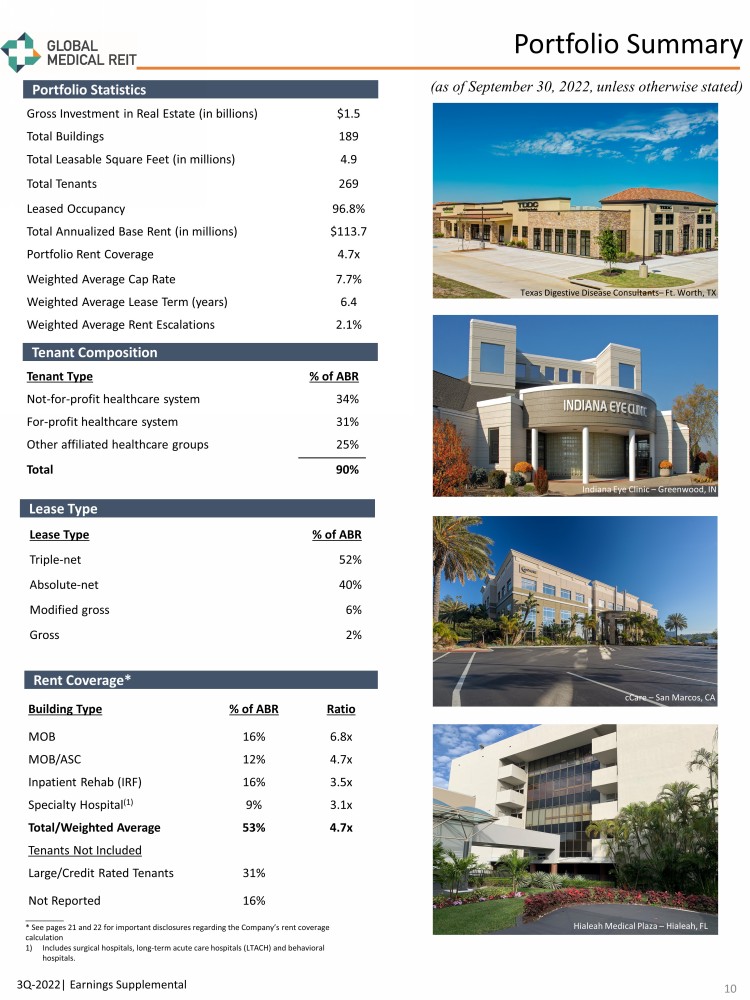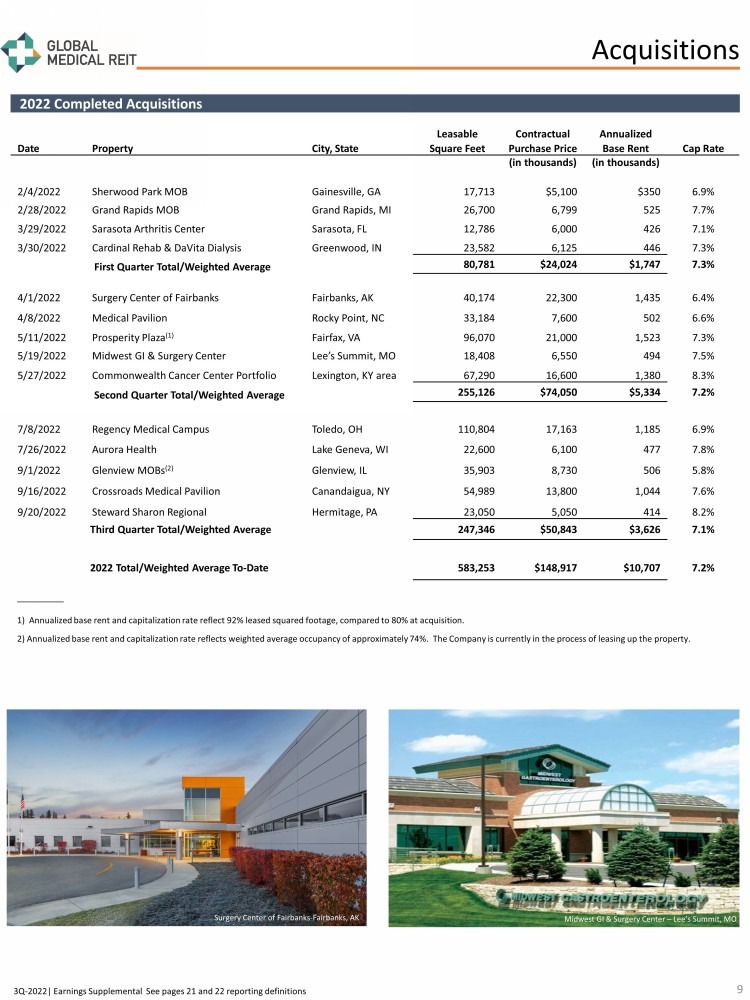 2022 Completed Acquisitions 3Q - 2022| Earnings Supplemental See pages 21 and 22 reporting definitions . Date Property City, State Leasable Square Feet Contractual Purchase Price Annualized Base Rent Cap Rate (in thousands) (in thousands) 2/4/2022 Sherwood Park MOB Gainesville, GA 17,713 $5,100 $350 6.9% 2/28/2022 Grand Rapids MOB Grand Rapids, MI 26,700 6,799 525 7.7% 3/29/2022 Sarasota Arthritis Center Sarasota, FL 12,786 6,000 426 7.1% 3/30/2022 Cardinal Rehab & DaVita Dialysis Greenwood, IN 23,582 6,125 446 7.3% First Quarter Total/Weighted Average 80,781 $24,024 $1,747 7.3% 4/1/2022 Surgery Center of Fairbanks Fairbanks, AK 40,174 22,300 1,435 6.4% 4/8/2022 Medical Pavilion Rocky Point, NC 33,184 7,600 502 6.6% 5/11/2022 Prosperity Plaza (1) Fairfax, VA 96,070 21,000 1,523 7.3% 5/19/2022 Midwest GI & Surgery Center Lee’s Summit, MO 18,408 6,550 494 7.5% 5/27/2022 Commonwealth Cancer Center Portfolio Lexington, KY area 67,290 16,600 1,380 8.3% Second Quarter Total/Weighted Average 255,126 $74,050 $5,334 7.2% 7/8/2022 Regency Medical Campus Toledo, OH 110,804 17,163 1,185 6.9% 7/26/2022 Aurora Health Lake Geneva, WI 22,600 6,100 477 7.8% 9/1/2022 Glenview MOBs (2) Glenview, IL 35,903 8,730 506 5.8% 9/16/2022 Crossroads Medical Pavilion Canandaigua, NY 54,989 13,800 1,044 7.6% 9/20/2022 Steward Sharon Regional Hermitage, PA 23,050 5,050 414 8.2% Third Quarter Total/Weighted Average 247,346 $50,843 $3,626 7.1% 2022 Total/Weighted Average To - Date 583,253 $148,917 $10,707 7.2% Acquisitions 9 __________ 1) Annualized base rent and capitalization rate reflect 92% leased squared footage, compared to 80% at acquisition. 2) Annualized base rent and capitalization rate reflects weighted average occupancy of approximately 74%. The Company is cur ren tly in the process of leasing up the property. Surgery Center of Fairbanks - Fairbanks, AK Midwest GI & Surgery Center – Lee’s Summit, MO