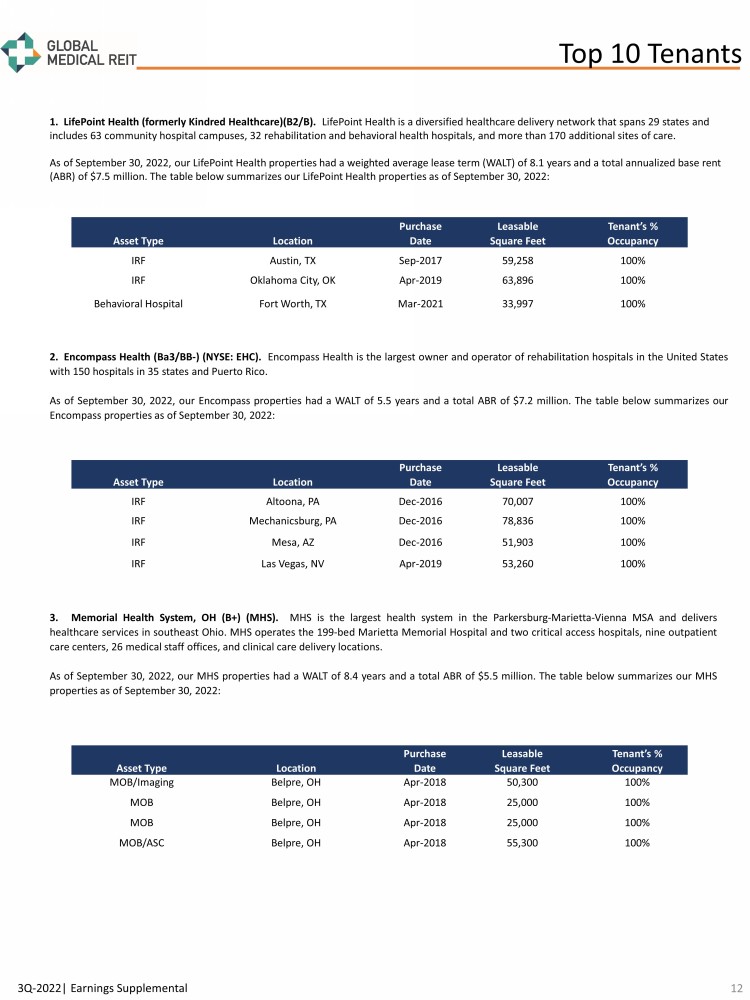 2. Encompass Health (Ba 3 /BB - ) (NYSE : EHC) . Encompass Health is the largest owner and operator of rehabilitation hospitals in the United States with 150 hospitals in 35 states and Puerto Rico . As of September 30 , 2022 , our Encompass properties had a WALT of 5 . 5 years and a total ABR of $ 7 . 2 million . The table below summarizes our Encompass properties as of September 30 , 2022 : 3Q - 2022| Earnings Supplemental 1. LifePoint Health (formerly Kindred Healthcare)(B2/B). LifePoint Health is a diversified healthcare delivery network that spans 29 states and includes 63 community hospital campuses, 32 rehabilitation and behavioral health hospitals, and more than 170 additional site s o f care. As of September 30, 2022, our LifePoint Health properties had a weighted average lease term (WALT) of 8.1 years and a total a nnu alized base rent (ABR) of $7.5 million. The table below summarizes our LifePoint Health properties as of September 30, 2022: Asset Type Location Purchase Date Leasable Square Feet Tenant’s % Occupancy IRF Austin, TX Sep - 2017 59,258 100% IRF Oklahoma City, OK Apr - 2019 63,896 100% Behavioral Hospital Fort Worth, TX Mar - 2021 33,997 100% Asset Type Location Purchase Date Leasable Square Feet Tenant’s % Occupancy IRF Altoona, PA Dec - 2016 70,007 100% IRF Mechanicsburg, PA Dec - 2016 78,836 100% IRF Mesa, AZ Dec - 2016 51,903 100% IRF Las Vegas, NV Apr - 2019 53,260 100% Top 10 Tenant s 12 3. Memorial Health System, OH (B+) (MHS) . MHS is the largest health system in the Parkersburg - Marietta - Vienna MSA and delivers healthcare services in southeast Ohio . MHS operates the 199 - bed Marietta Memorial Hospital and two critical access hospitals, nine outpatient care centers, 26 medical staff offices, and clinical care delivery locations . As of September 30 , 2022 , our MHS properties had a WALT of 8 . 4 years and a total ABR of $ 5 . 5 million . The table below summarizes our MHS properties as of September 30 , 2022 : Asset Type Location Purchase Date Leasable Square Feet Tenant’s % Occupancy MOB/Imaging Belpre, OH Apr - 2018 50,300 100% MOB Belpre, OH Apr - 2018 25,000 100% MOB Belpre, OH Apr - 2018 25,000 100% MOB/ASC Belpre, OH Apr - 2018 55,300 100%