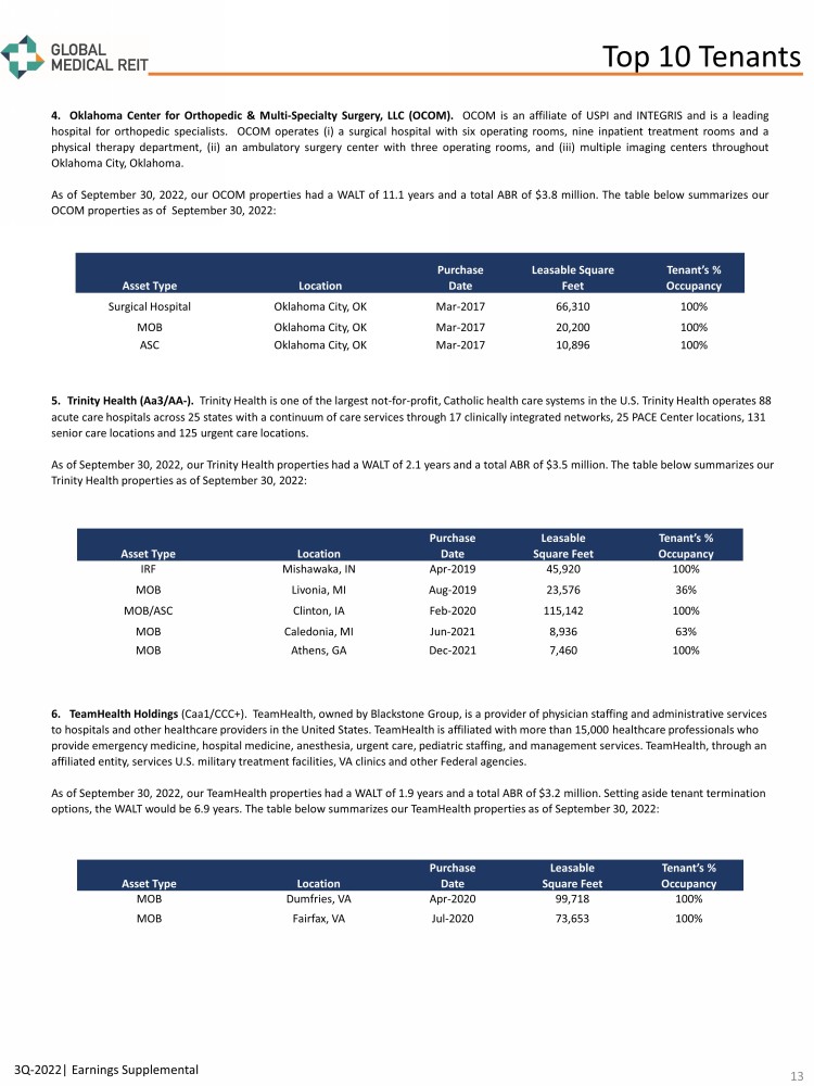 3Q - 2022| Earnings Supplemental 4 . Oklahoma Center for Orthopedic & Multi - Specialty Surgery, LLC (OCOM) . OCOM is an affiliate of USPI and INTEGRIS and is a leading hospital for orthopedic specialists . OCOM operates (i) a surgical hospital with six operating rooms, nine inpatient treatment rooms and a physical therapy department, (ii) an ambulatory surgery center with three operating rooms, and (iii) multiple imaging centers throughout Oklahoma City, Oklahoma . As of September 30 , 2022 , our OCOM properties had a WALT of 11 . 1 years and a total ABR of $ 3 . 8 million . The table below summarizes our OCOM properties as of September 30 , 2022 : Asset Type Location Purchase Date Leasable Square Feet Tenant’s % Occupancy Surgical Hospital Oklahoma City, OK Mar - 2017 66,310 100% MOB Oklahoma City, OK Mar - 2017 20,200 100% ASC Oklahoma City, OK Mar - 2017 10,896 100% Top 10 Tenants 13 5. Trinity Health (Aa3/AA - ). Trinity Health is one of the largest not - for - profit, Catholic health care systems in the U.S. Trinity Health operates 88 acute care hospitals across 25 states with a continuum of care services through 17 clinically integrated networks, 25 PACE Ce nte r locations, 131 senior care locations and 125 urgent care locations. As of September 30, 2022, our Trinity Health properties had a WALT of 2.1 years and a total ABR of $3.5 million . The table below summarizes our Trinity Health properties as of September 30, 2022: Asset Type Location Purchase Date Leasable Square Feet Tenant’s % Occupancy IRF Mishawaka, IN Apr - 2019 45,920 100% MOB Livonia, MI Aug - 2019 23,576 36% MOB/ASC Clinton, IA Feb - 2020 115,142 100% MOB Caledonia, MI Jun - 2021 8,936 63% MOB Athens, GA Dec - 2021 7,460 100% 6. TeamHealth Holdings (Caa1/CCC+). TeamHealth, owned by Blackstone Group, is a provider of physician staffing and administrative services to hospitals and other healthcare providers in the United States. TeamHealth is affiliated with more than 15,000 healthcare p rof essionals who provide emergency medicine, hospital medicine, anesthesia, urgent care, pediatric staffing, and management services. TeamHeal th, through an affiliated entity, services U.S. military treatment facilities, VA clinics and other Federal agencies. As of September 30, 2022, our TeamHealth properties had a WALT of 1.9 years and a total ABR of $3.2 million . Setting aside tenant termination options, the WALT would be 6.9 years. The table below summarizes our TeamHealth properties as of September 30, 2022: Asset Type Location Purchase Date Leasable Square Feet Tenant’s % Occupancy MOB Dumfries, VA Apr - 2020 99,718 100% MOB Fairfax, VA Jul - 2020 73,653 100%