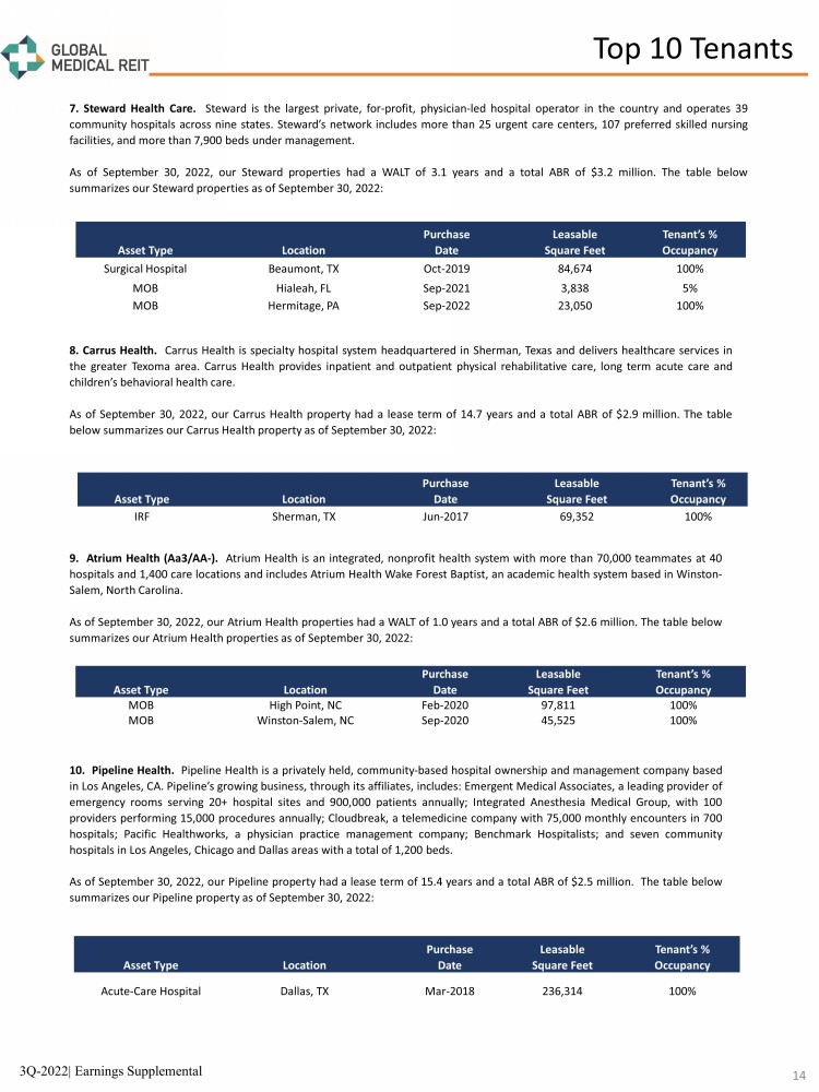 3Q - 2022| Earnings Supplemental 7 . Steward Health Care . Steward is the largest private, for - profit, physician - led hospital operator in the country and operates 39 community hospitals across nine states . Steward’s network includes more than 25 urgent care centers, 107 preferred skilled nursing facilities, and more than 7 , 900 beds under management . As of September 30 , 2022 , our Steward properties had a WALT of 3 . 1 years and a total ABR of $ 3 . 2 million . The table below summarizes our Steward properties as of September 30 , 2022 : Asset Type Location Purchase Date Leasable Square Feet Tenant’s % Occupancy Surgical Hospital Beaumont, TX Oct - 2019 84,674 100% MOB Hialeah, FL Sep - 2021 3,838 5% MOB Hermitage, PA Sep - 2022 23,050 100% 8 . Carrus Health . Carrus Health is specialty hospital system headquartered in Sherman, Texas and delivers healthcare services in the greater Texoma area . Carrus Health provides inpatient and outpatient physical rehabilitative care, long term acute care and children’s behavioral health care . As of September 30 , 2022 , our Carrus Health property had a lease term of 14 . 7 years and a total ABR of $ 2 . 9 million . The table below summarizes our Carrus Health property as of September 30 , 2022 : Asset Type Location Purchase Date Leasable Square Feet Tenant’s % Occupancy IRF Sherman, TX Jun - 2017 69,352 100% Top 10 Tenants 14 9 . Atrium Health (Aa 3 /AA - ) . Atrium Health is an integrated, nonprofit health system with more than 70 , 000 teammates at 40 hospitals and 1 , 400 care locations and includes Atrium Health Wake Forest Baptist, an academic health system based in Winston - Salem, North Carolina . As of September 30 , 2022 , our Atrium Health properties had a WALT of 1 . 0 years and a total ABR of $ 2 . 6 million . The table below summarizes our Atrium Health properties as of September 30 , 2022 : Asset Type Location Purchase Date Leasable Square Feet Tenant’s % Occupancy MOB High Point, NC Feb - 2020 97,811 100% MOB Winston - Salem, NC Sep - 2020 45,525 100% 10 . Pipeline Health . Pipeline Health is a privately held, community-based hospital ownership and management company based in Los Angeles, CA . Pipeline’s growing business, through its affiliates, includes : Emergent Medical Associates, a leading provider of emergency rooms serving 20 + hospital sites and 900 , 000 patients annually ; Integrated Anesthesia Medical Group, with 100 providers performing 15 , 000 procedures annually ; Cloudbreak , a telemedicine company with 75 , 000 monthly encounters in 700 hospitals ; Pacific Healthworks, a physician practice management company ; Benchmark Hospitalists ; and seven community hospitals in Los Angeles, Chicago and Dallas areas with a total of 1 , 200 beds . As of September 30 , 2022 , our Pipeline property had a lease term of 15 . 4 years and a total ABR of $ 2 . 5 million . The table below summarizes our Pipeline property as of September 30 , 2022 : Asset Type Location Purchase Date Leasable Square Feet Tenant’s % Occupancy Acute - Care Hospital Dallas, TX Mar - 2018 236,314 100%