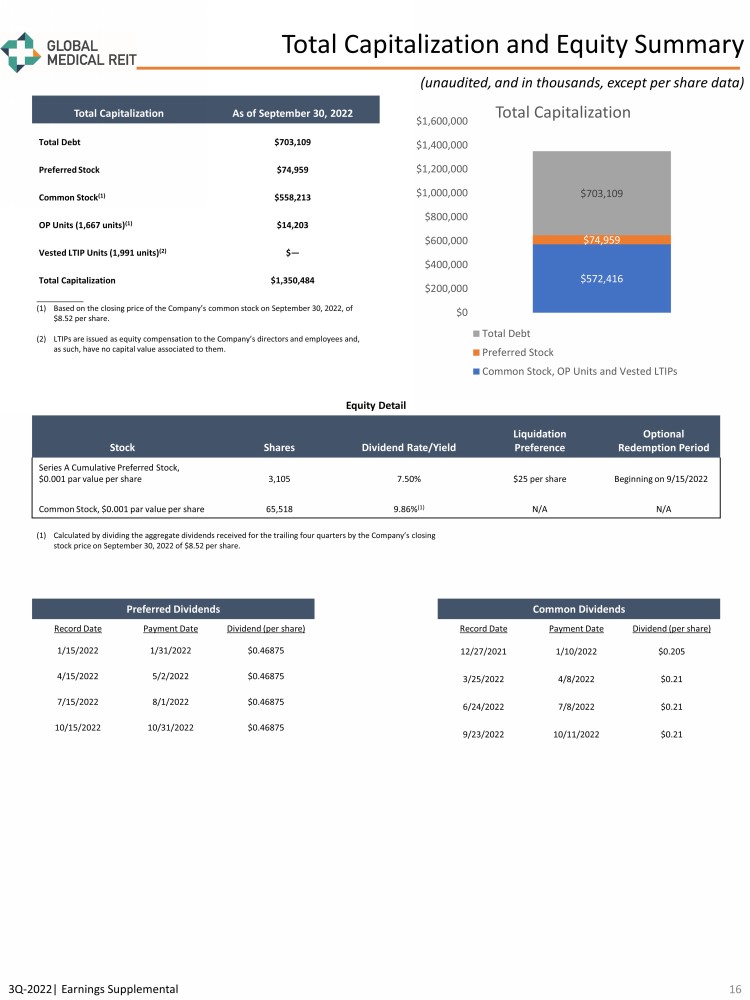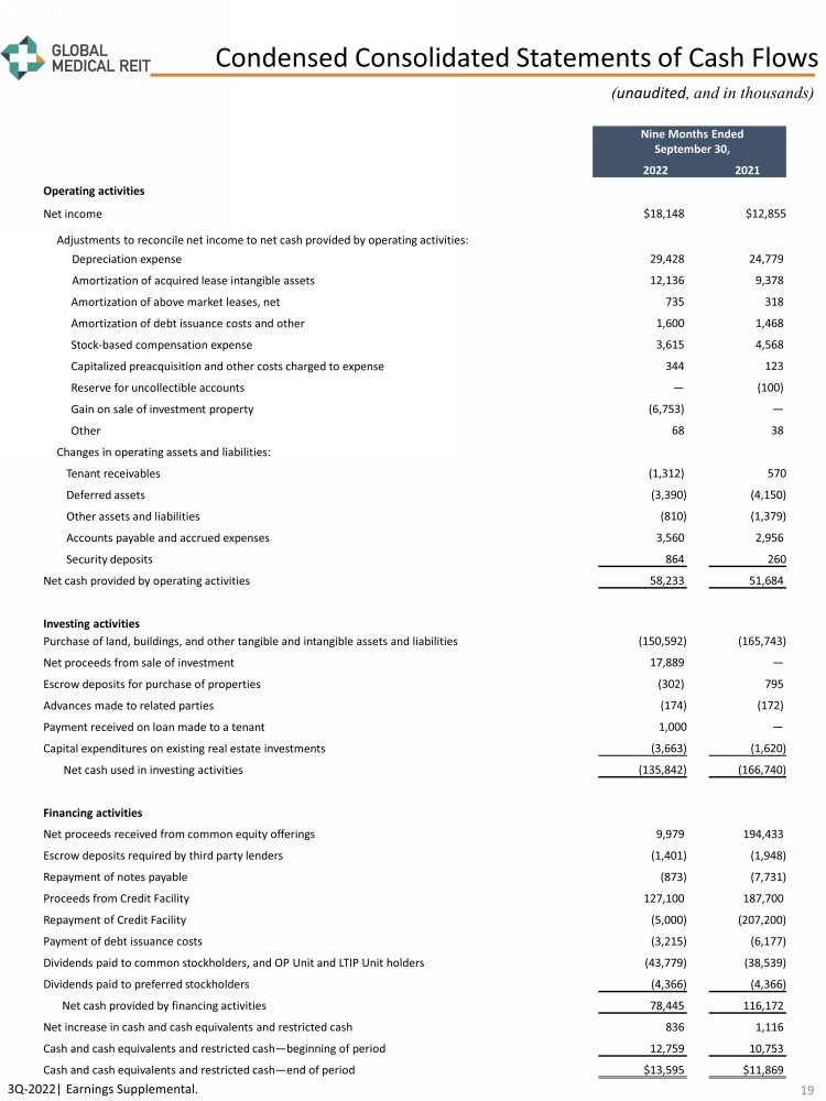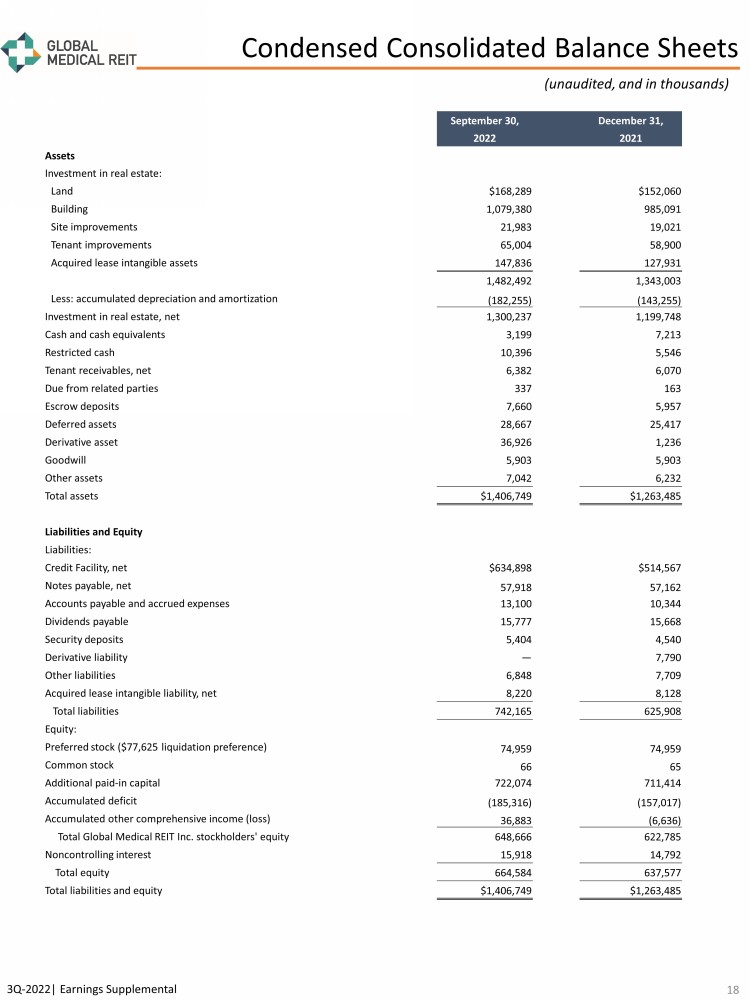 3Q - 2022| Earnings Supplemental (unaudited, and in thousands) September 30, December 31, 2022 2021 Assets Investment in real estate: Land $168,289 $152,060 Building 1,079,380 985,091 Site improvements 21,983 19,021 Tenant improvements 65,004 58,900 Acquired lease intangible assets 147,836 127,931 1,482,492 1,343,003 Less: accumulated depreciation and amortization (182,255) (143,255) Investment in real estate, net 1,300,237 1,199,748 Cash and cash equivalents 3,199 7,213 Restricted cash 10,396 5,546 Tenant receivables, net 6,382 6,070 Due from related parties 337 163 Escrow deposits 7,660 5,957 Deferred assets 28,667 25,417 Derivative asset 36,926 1,236 Goodwill 5,903 5,903 Other assets 7,042 6,232 Total assets $1,406,749 $1,263,485 Liabilities and Equity Liabilities: Credit Facility, net $634,898 $514,567 Notes payable, net 57,918 57,162 Accounts payable and accrued expenses 13,100 10,344 Dividends payable 15,777 15,668 Security deposits 5,404 4,540 Derivative liability — 7,790 Other liabilities 6,848 7,709 Acquired lease intangible liability, net 8,220 8,128 Total liabilities 742,165 625,908 Equity: Preferred stock ($77,625 liquidation preference) 74,959 74,959 Common stock 66 65 Additional paid - in capital 722,074 711,414 Accumulated deficit (185,316) (157,017) Accumulated other comprehensive income (loss) 36,883 (6,636) Total Global Medical REIT Inc. stockholders' equity 648,666 622,785 Noncontrolling interest 15,918 14,792 Total equity 664,584 637,577 Total liabilities and equity $1,406,749 $1,263,485 Condensed Consolidated Balance Sheets 18