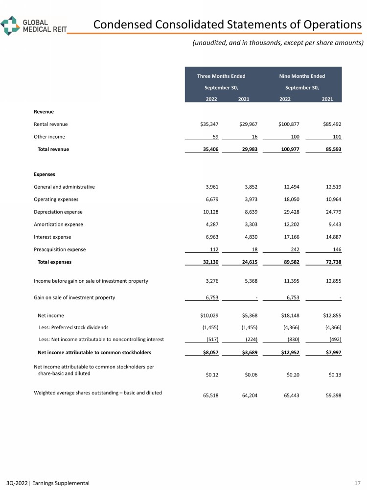 3Q - 2022| Earnings Supplemental (unaudited, and in thousands, except per share amounts) Three Months Ended Nine Months Ended September 30, September 30, 2022 2021 2022 2021 Revenue Rental revenue $35,347 $29,967 $100,877 $85,492 Other income 59 16 100 101 Total revenue 35,406 29,983 100,977 85,593 Expenses General and administrative 3,961 3,852 12,494 12,519 Operating expenses 6,679 3,973 18,050 10,964 Depreciation expense 10,128 8,639 29,428 24,779 Amortization expense 4,287 3,303 12,202 9,443 Interest expense 6,963 4,830 17,166 14,887 Preacquisition expense 112 18 242 146 Total expenses 32,130 24,615 89,582 72,738 Income before gain on sale of investment property 3,276 5,368 11,395 12,855 Gain on sale of investment property 6,753 - 6,753 - Net income $10,029 $5,368 $18,148 $12,855 Less: Preferred stock dividends (1,455) (1,455) (4,366) (4,366) Less: Net income attributable to noncontrolling interest (517) (224) (830) (492) Net income attributable to common stockholders $8,057 $3,689 $12,952 $7,997 Net income attributable to common stockholders per share - basic and diluted $0.12 $0.06 $0.20 $0.13 Weighted average shares outstanding – basic and diluted 65,518 64,204 65,443 59,398 Condensed Consolidated Statements of Operations 17