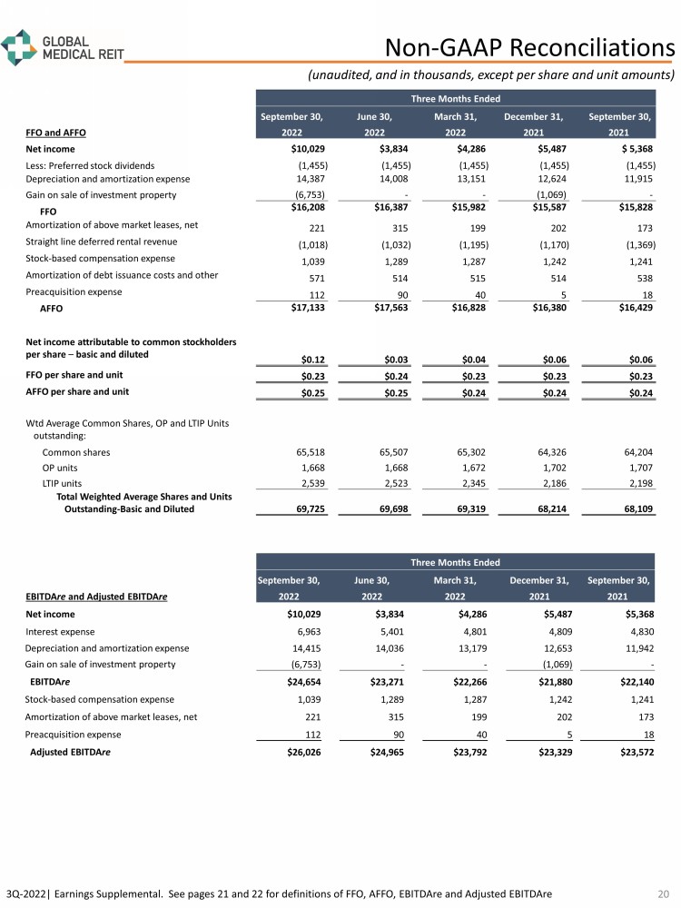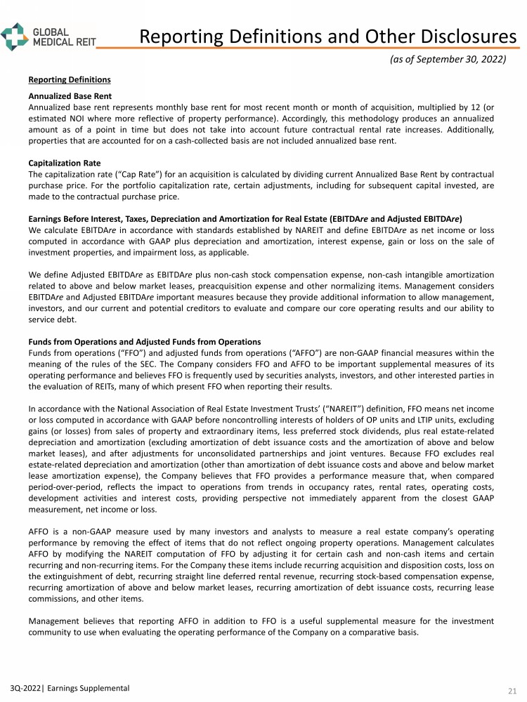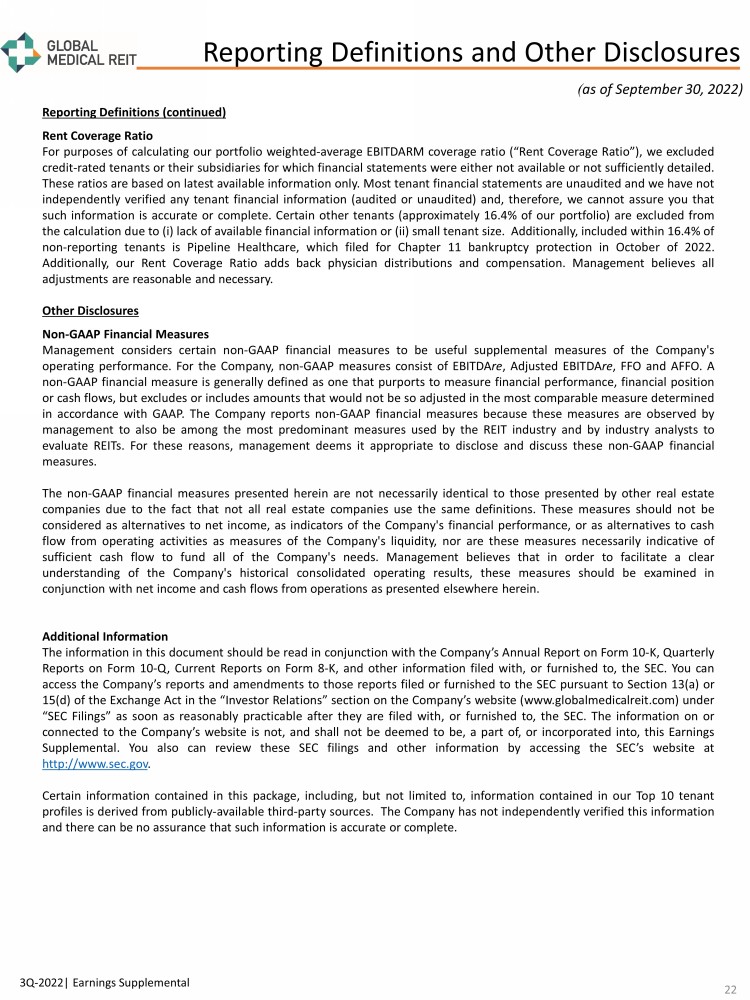 Reporting Definitions (continued) Rent Coverage Ratio For purposes of calculating our portfolio weighted - average EBITDARM coverage ratio (“Rent Coverage Ratio”), we excluded credit - rated tenants or their subsidiaries for which financial statements were either not available or not sufficiently detailed . These ratios are based on latest available information only . Most tenant financial statements are unaudited and we have not independently verified any tenant financial information (audited or unaudited) and, therefore, we cannot assure you that such information is accurate or complete . Certain other tenants (approximately 16 . 4 % of our portfolio) are excluded from the calculation due to (i) lack of available financial information or (ii) small tenant size . Additionally, included within 16 . 4 % of non - reporting tenants is Pipeline Healthcare, which filed for Chapter 11 bankruptcy protection in October of 2022 . Additionally, our Rent Coverage Ratio adds back physician distributions and compensation . Management believes all adjustments are reasonable and necessary . Other Disclosures Non - GAAP Financial Measures Management considers certain non - GAAP financial measures to be useful supplemental measures of the Company's operating performance . For the Company, non - GAAP measures consist of EBITDA re , Adjusted EBITDA re , FFO and AFFO . A non - GAAP financial measure is generally defined as one that purports to measure financial performance, financial position or cash flows, but excludes or includes amounts that would not be so adjusted in the most comparable measure determined in accordance with GAAP . The Company reports non - GAAP financial measures because these measures are observed by management to also be among the most predominant measures used by the REIT industry and by industry analysts to evaluate REITs . For these reasons, management deems it appropriate to disclose and discuss these non - GAAP financial measures . The non - GAAP financial measures presented herein are not necessarily identical to those presented by other real estate companies due to the fact that not all real estate companies use the same definitions . These measures should not be considered as alternatives to net income, as indicators of the Company's financial performance, or as alternatives to cash flow from operating activities as measures of the Company's liquidity, nor are these measures necessarily indicative of sufficient cash flow to fund all of the Company's needs . Management believes that in order to facilitate a clear understanding of the Company's historical consolidated operating results, these measures should be examined in conjunction with net income and cash flows from operations as presented elsewhere herein . Additional Information The information in this document should be read in conjunction with the Company’s Annual Report on Form 10 - K, Quarterly Reports on Form 10 - Q, Current Reports on Form 8 - K, and other information filed with, or furnished to, the SEC . You can access the Company’s reports and amendments to those reports filed or furnished to the SEC pursuant to Section 13 (a) or 15 (d) of the Exchange Act in the “Investor Relations” section on the Company’s website (www . globalmedicalreit . com) under “SEC Filings” as soon as reasonably practicable after they are filed with, or furnished to, the SEC . The information on or connected to the Company’s website is not, and shall not be deemed to be, a part of, or incorporated into, this Earnings Supplemental . You also can review these SEC filings and other information by accessing the SEC’s website at http : //www . sec . gov . Certain information contained in this package, including, but not limited to, information contained in our Top 10 tenant profiles is derived from publicly - available third - party sources . The Company has not independently verified this information and there can be no assurance that such information is accurate or complete . ( as of September 30, 2022) 3Q - 2022| Earnings Supplemental Reporting Definitions and Other Disclosures 22