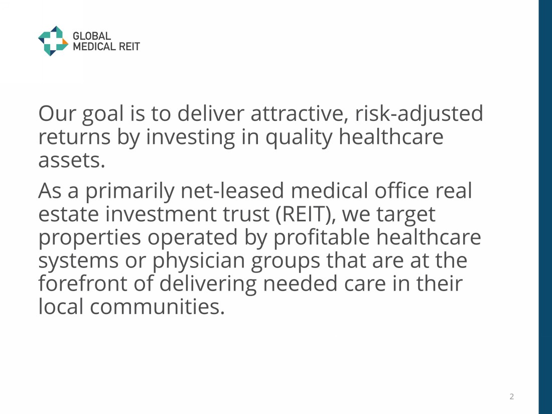 Our goal is to deliver attractive, risk - adjusted returns by investing in quality healthcare assets. As a primarily net - leased medical office real estate investment trust (REIT), we target properties operated by profitable healthcare systems or physician groups that are at the forefront of delivering needed care in their local communities. 2