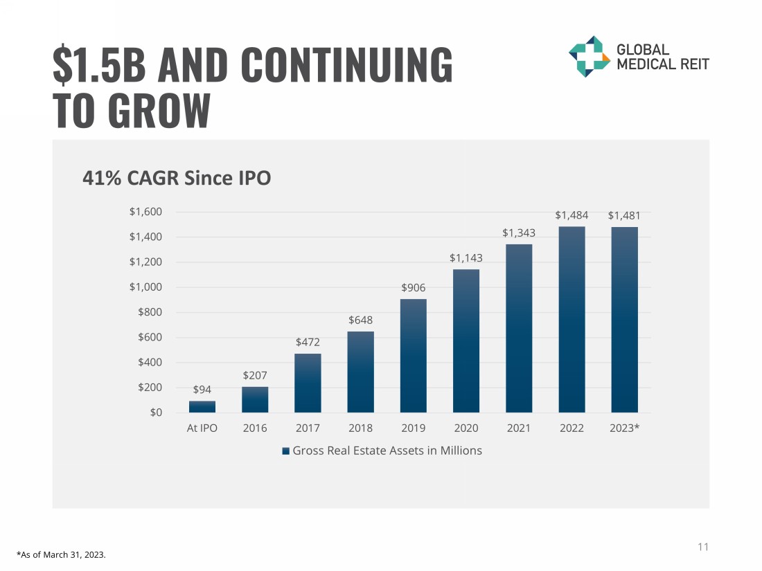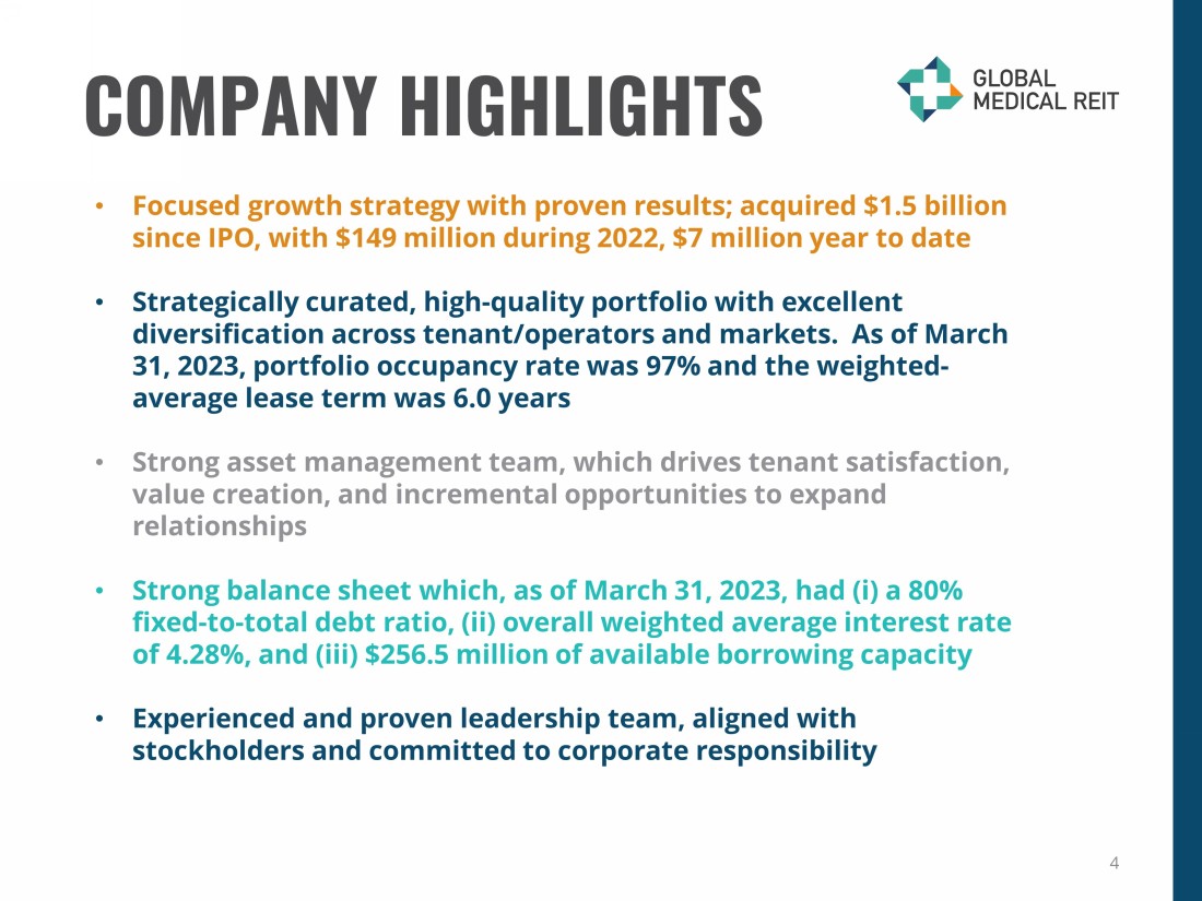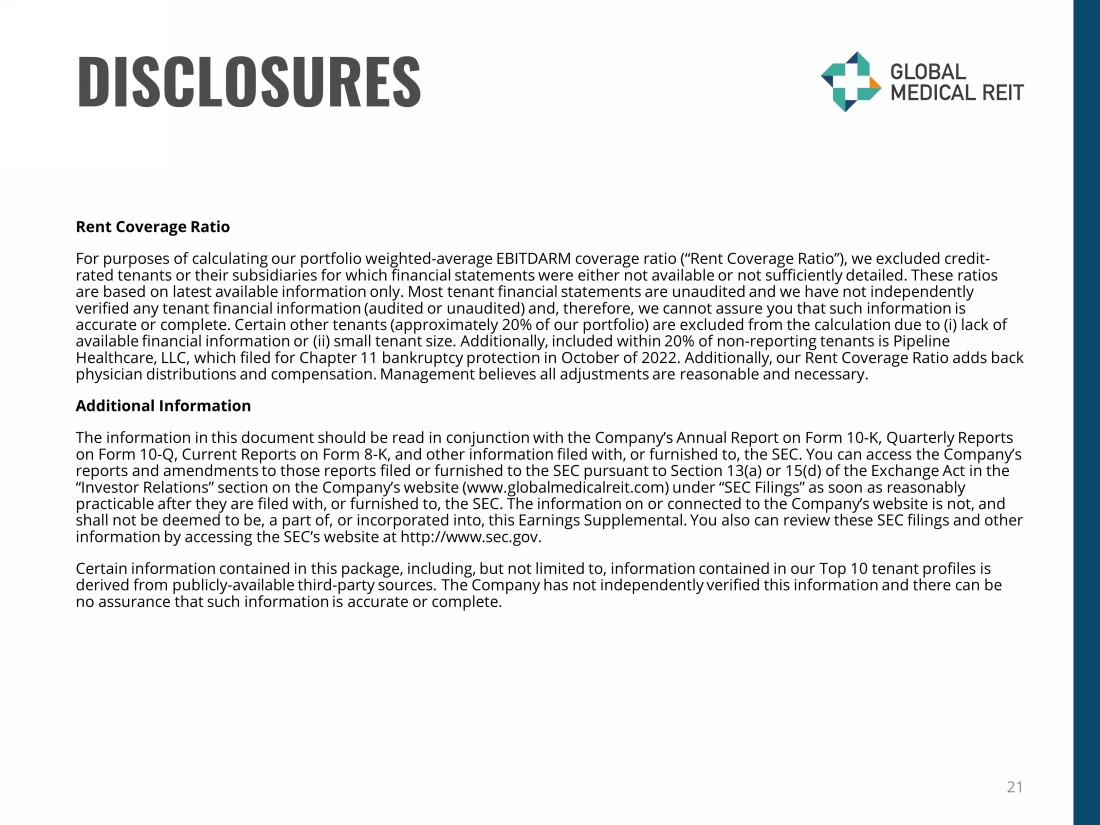 DISCLOSURES Rent Coverage Ratio For purposes of calculating our portfolio weighted - average EBITDARM coverage ratio (“Rent Coverage Ratio”), we excluded credit - rated tenants or their subsidiaries for which financial statements were either not available or not sufficiently detailed. Th ese ratios are based on latest available information only. Most tenant financial statements are unaudited and we have not independently verified any tenant financial information (audited or unaudited) and, therefore, we cannot assure you that such information i s accurate or complete. Certain other tenants (approximately 20% of our portfolio) are excluded from the calculation due to ( i ) lack of available financial information or (ii) small tenant size. Additionally, included within 20% of non - reporting tenants is Pipelin e Healthcare, LLC, which filed for Chapter 11 bankruptcy protection in October of 2022. Additionally, our Rent Coverage Ratio a dds back physician distributions and compensation. Management believes all adjustments are reasonable and necessary. Additional Information The information in this document should be read in conjunction with the Company’s Annual Report on Form 10 - K, Quarterly Reports on Form 10 - Q, Current Reports on Form 8 - K, and other information filed with, or furnished to, the SEC. You can access the Compan y’s reports and amendments to those reports filed or furnished to the SEC pursuant to Section 13(a) or 15(d) of the Exchange Act in the “Investor Relations” section on the Company’s website (www.globalmedicalreit.com) under “SEC Filings” as soon as reasonably practicable after they are filed with, or furnished to, the SEC. The information on or connected to the Company’s website is not , and shall not be deemed to be, a part of, or incorporated into, this Earnings Supplemental. You also can review these SEC filings an d other information by accessing the SEC’s website at http://www.sec.gov. Certain information contained in this package, including, but not limited to, information contained in our Top 10 tenant prof ile s is derived from publicly - available third - party sources. The Company has not independently verified this information and there can b e no assurance that such information is accurate or complete. 21