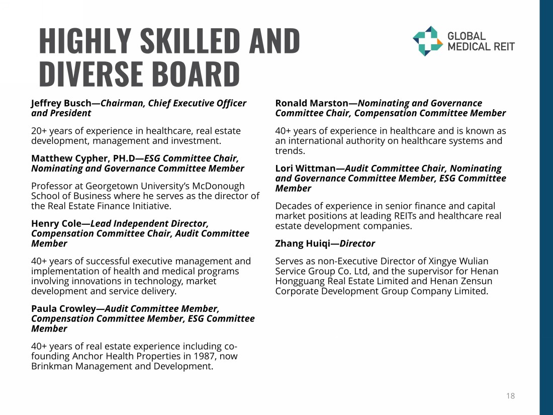 INSTITUTIONAL KNOWLEDGE, HANDS - ON APPROACH Jeffrey Busch — Chairman, Chief Executive Officer and President 20+ years of experience in healthcare, real estate development, management and investment Robert Kiernan — Chief Financial Officer and Treasurer 30+ years of experience in financial accounting, reporting and management, with extensive experience in SEC reporting and SOX compliance Alfonzo Leon — Chief Investment Officer 20+ years of experience in real estate finance and has completed $3 billion of transactions Danica Holley — Chief Operating Officer 20+ years of management and business development experience Jamie Barber — General Counsel and Corporate Secretary 15+ years of experience with SEC compliance and reporting matters, corporate governance, investment banking and REIT - related capital markets 17