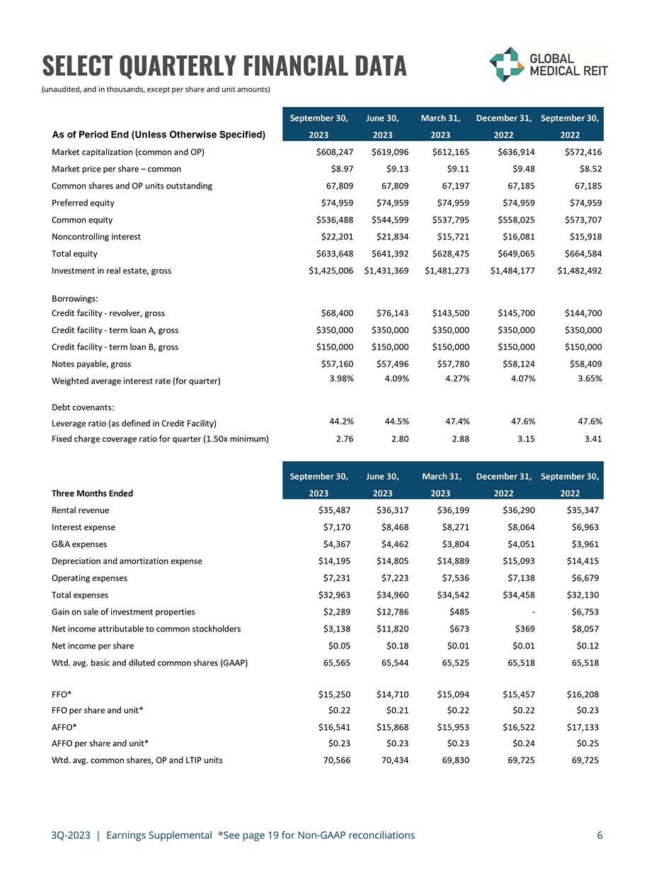 3Q - 2023 | Earnings Supplemental 5 COMPANY OVERVIEW Corporate Headquarters Global Medical REIT Inc. 7373 Wisconsin Avenue, Suite 800 Bethesda, MD 20814 Phone: 202.524.6851 www.globalmedicalreit.com Stock Exchange New York Stock Exchange Ticker: GMRE Investor Relations Stephen Swett Phone: 203.682.8377 Email: stephen.swett@icrinc.com Independent Registered Public Accounting Firm Deloitte & Touche LLP McLean, VA Corporate and REIT Tax Counsel Vinson & Elkins LLP Daniel LeBey , Corporate Partner Christopher Mangin , REIT Tax Partner Transfer Agent American Stock Transfer & Trust Company Phone: 800.937.5449 Cobalt Rehabilitation Hospital – Surprise, AZ Firm Name Baird Wes Golladay BMO Juan Sanabria B. Riley Securities Bryan Maher Colliers Securities Barry Oxford Compass Point Merrill Ross JMP Securities Aaron Hecht Janney Robert Stevenson KeyBanc Austin Wurschmidt Stifel Stephen Manaker Sell - Side Analyst Coverage