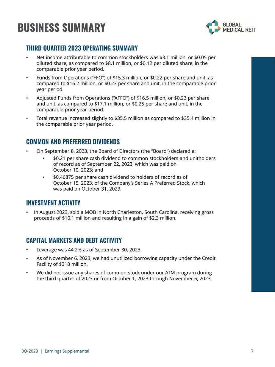 3Q - 2023 | Earnings Supplemental 7 THIRD QUARTER 2023 OPERATING SUMMARY • Net income attributable to common stockholders was $3.1 million, or $0.05 per diluted share, as compared to $8.1 million, or $0.12 per diluted share, in the comparable prior year period. • Funds from Operations (“FFO”) of $15.3 million, or $0.22 per share and unit, as compared to $16.2 million, or $0.23 per share and unit, in the comparable prior year period. • Adjusted Funds from Operations (“AFFO”) of $16.5 million, or $0.23 per share and unit, as compared to $17.1 million, or $0.25 per share and unit, in the comparable prior year period. • Total revenue increased slightly to $35.5 million as compared to $35.4 million in the comparable prior year period. COMMON AND PREFERRED DIVIDENDS • On September 8, 2023, the Board of Directors (the “Board”) declared a: • $0.21 per share cash dividend to common stockholders and unitholders of record as of September 22, 2023, which was paid on October 10, 2023; and • $0.46875 per share cash dividend to holders of record as of October 15, 2023, of the Company’s Series A Preferred Stock, which was paid on October 31, 2023. INVESTMENT ACTIVITY • In August 2023, sold a MOB in North Charleston, South Carolina, receiving gross proceeds of $10.1 million and resulting in a gain of $2.3 million. CAPITAL MARKETS AND DEBT ACTIVITY • Leverage was 44.2 % as of September 30 , 2023. • As of November 6, 2023, we had unutilized borrowing capacity under the Credit Facility of $318 million. • We did not issue any shares of common stock under our ATM program during the third quarter of 2023 or from October 1, 2023 through November 6, 2023. BUSINESS SUMMARY