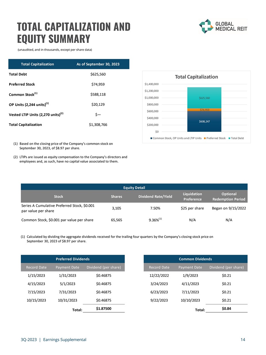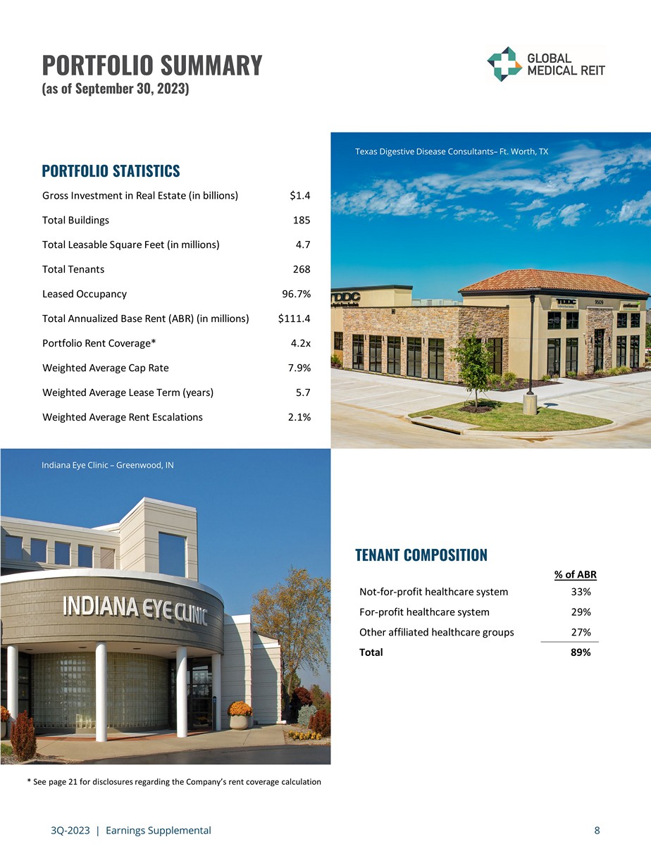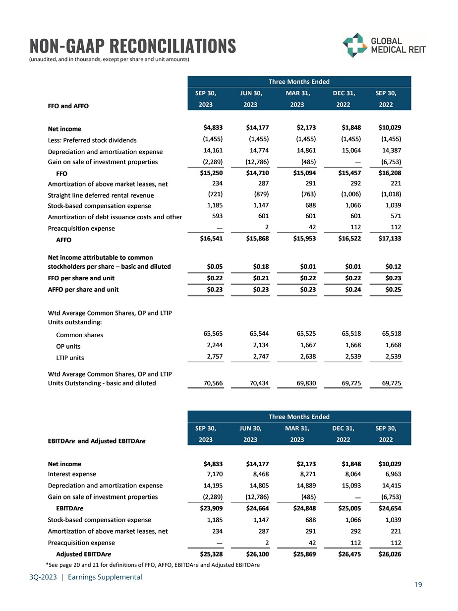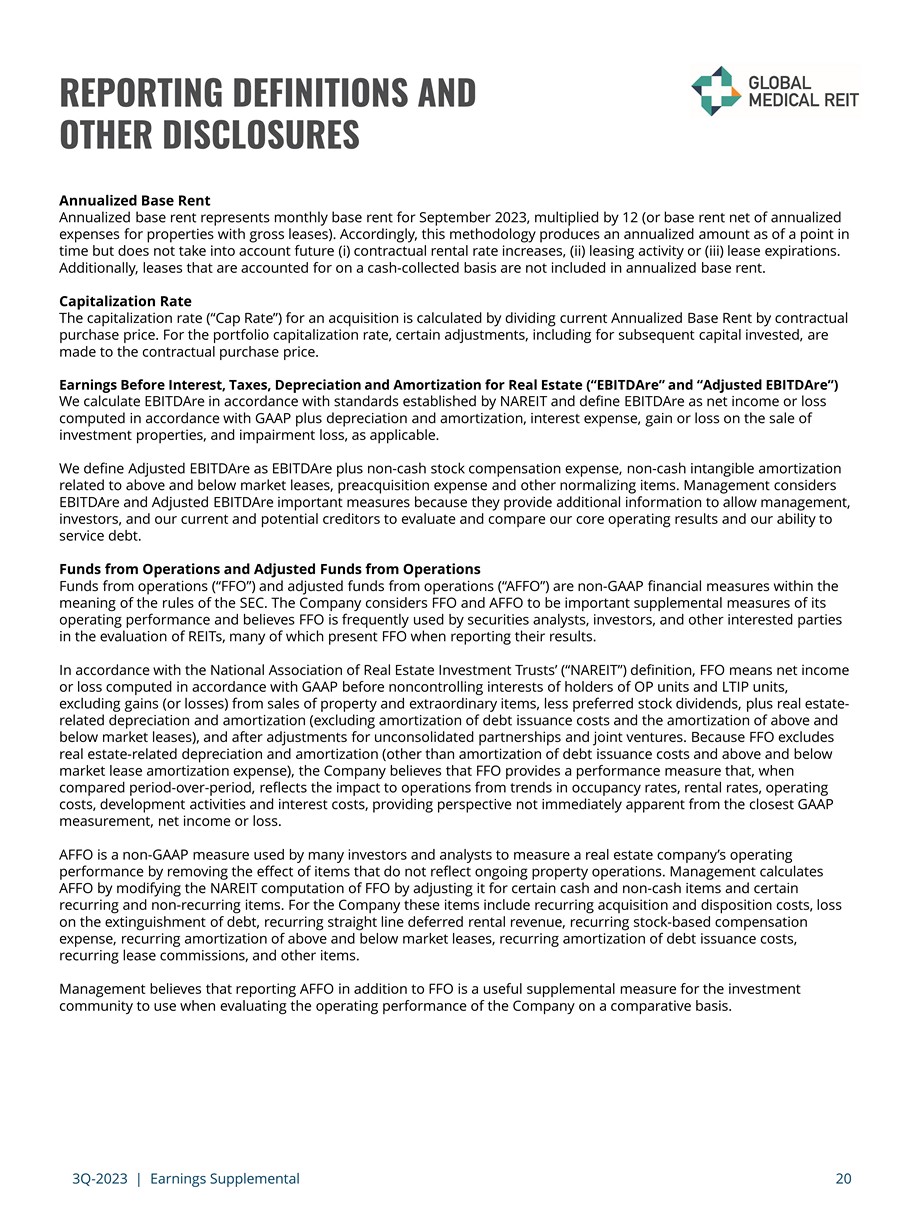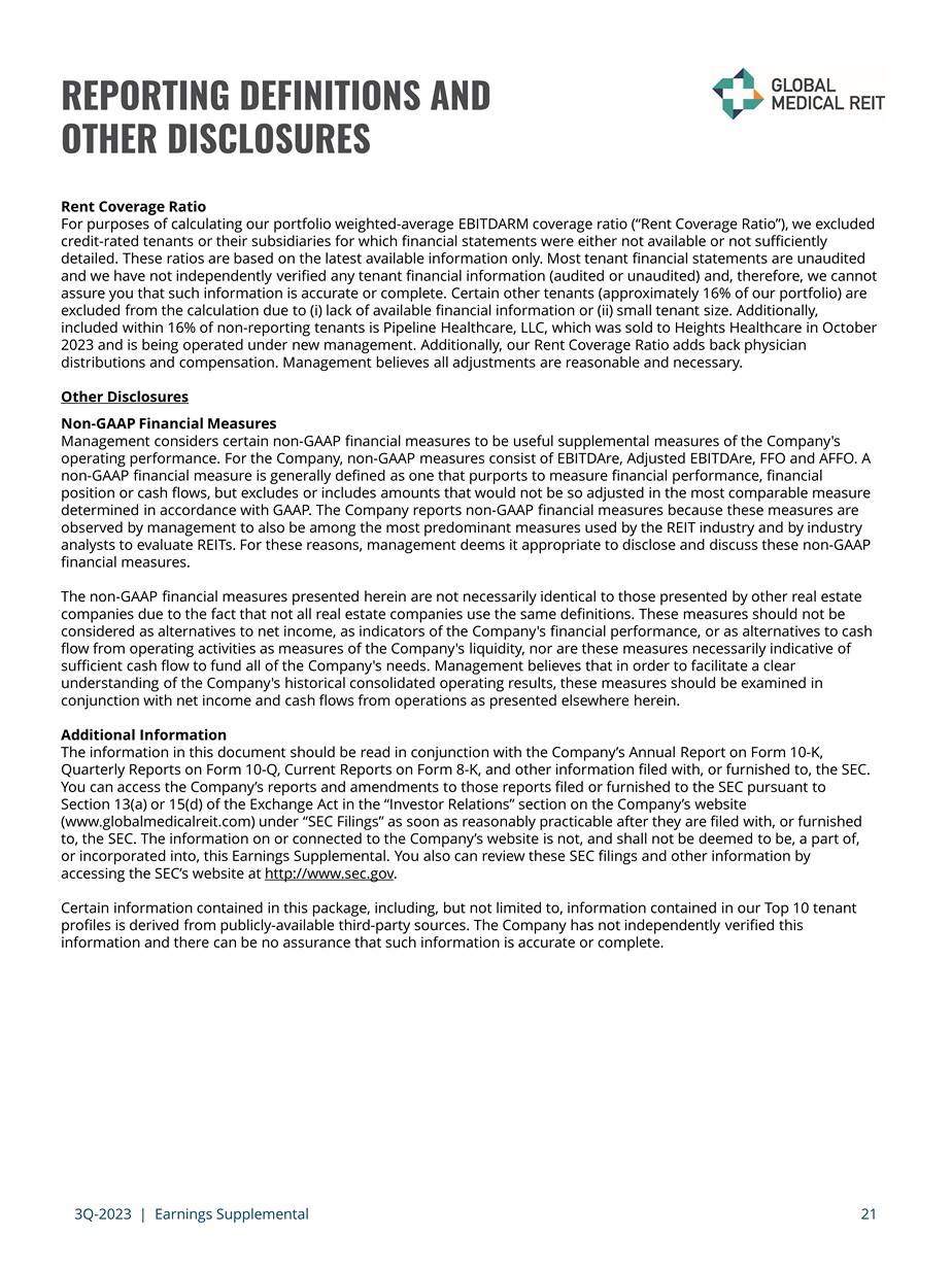 3Q - 2023 | Earnings Supplemental 21 REPORTING DEFINITIONS AND OTHER DISCLOSURES Rent Coverage Ratio For purposes of calculating our portfolio weighted - average EBITDARM coverage ratio (“Rent Coverage Ratio”), we excluded credit - rated tenants or their subsidiaries for which financial statements were either not available or not sufficiently detailed. These ratios are based on the latest available information only. Most tenant financial statements are unaudited and we have not independently verified any tenant financial information (audited or unaudited) and, therefore, we cannot assure you that such information is accurate or complete. Certain other tenants (approximately 16% of our portfolio) are excluded from the calculation due to (i) lack of available financial information or (ii) small tenant size. Additionally, included within 16% of non - reporting tenants is Pipeline Healthcare, LLC, which was sold to Heights Healthcare in October 2023 and is being operated under new management. Additionally, our Rent Coverage Ratio adds back physician distributions and compensation. Management believes all adjustments are reasonable and necessary. Other Disclosures Non - GAAP Financial Measures Management considers certain non - GAAP financial measures to be useful supplemental measures of the Company's operating performance. For the Company, non - GAAP measures consist of EBITDAre , Adjusted EBITDAre , FFO and AFFO. A non - GAAP financial measure is generally defined as one that purports to measure financial performance, financial position or cash flows, but excludes or includes amounts that would not be so adjusted in the most comparable measure determined in accordance with GAAP. The Company reports non - GAAP financial measures because these measures are observed by management to also be among the most predominant measures used by the REIT industry and by industry analysts to evaluate REITs. For these reasons, management deems it appropriate to disclose and discuss these non - GAAP financial measures. The non - GAAP financial measures presented herein are not necessarily identical to those presented by other real estate companies due to the fact that not all real estate companies use the same definitions. These measures should not be considered as alternatives to net income, as indicators of the Company's financial performance, or as alternatives to cash flow from operating activities as measures of the Company's liquidity, nor are these measures necessarily indicative of sufficient cash flow to fund all of the Company's needs. Management believes that in order to facilitate a clear understanding of the Company's historical consolidated operating results, these measures should be examined in conjunction with net income and cash flows from operations as presented elsewhere herein. Additional Information The information in this document should be read in conjunction with the Company’s Annual Report on Form 10 - K, Quarterly Reports on Form 10 - Q, Current Reports on Form 8 - K, and other information filed with, or furnished to, the SEC. You can access the Company’s reports and amendments to those reports filed or furnished to the SEC pursuant to Section 13(a) or 15(d) of the Exchange Act in the “Investor Relations” section on the Company’s website (www.globalmedicalreit.com) under “SEC Filings” as soon as reasonably practicable after they are filed with, or furnished to, the SEC. The information on or connected to the Company’s website is not, and shall not be deemed to be, a part of, or incorporated into, this Earnings Supplemental. You also can review these SEC filings and other information by accessing the SEC’s website at http://www.sec.gov . Certain information contained in this package, including, but not limited to, information contained in our Top 10 tenant profiles is derived from publicly - available third - party sources. The Company has not independently verified this information and there can be no assurance that such information is accurate or complete.