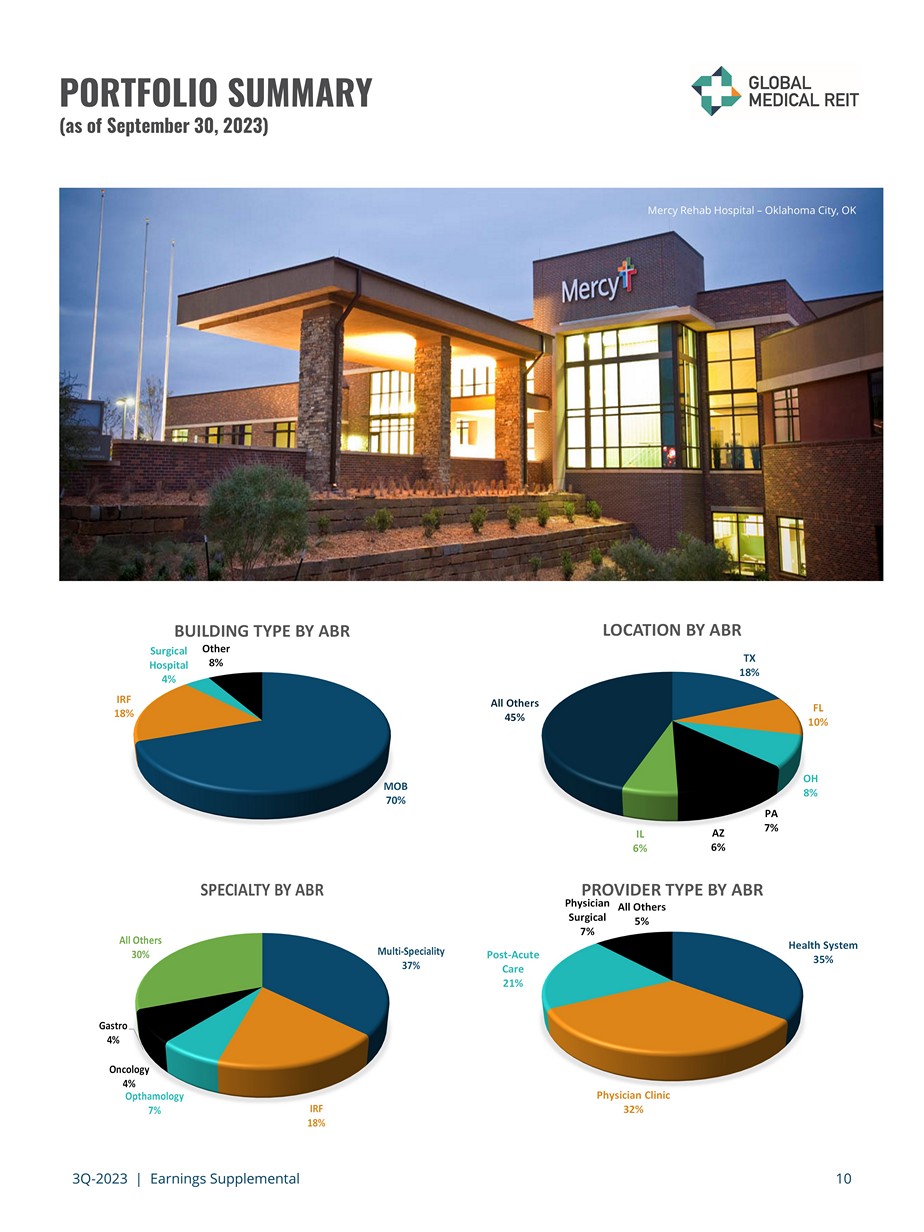3Q - 2023 | Earnings Supplemental 9 PORTFOLIO SUMMARY (as of September 30, 2023) LEASE TYPE RENT COVERAGE* * See page 21 for disclosures regarding the Company’s rent coverage calculation 1) Includes surgical hospitals, long - term acute care hospitals (LTACH) and behavioral hospitals. cCare – San Marcos, CA Hialeah Medical Plaza – Hialeah, FL % of ABR Triple-net 54% Absolute-net 37% Modified gross 7% Gross 2% Asset Type % of ABR Ratio MOB 16% 5.7x MOB/ASC 13% 4.1x Inpatient Rehab (IRF) 17% 3.5x Specialty Hospital (1) 6% 2.4x Total/Weighted Average 52% 4.2x Tenants Not Included Large/Credit Rated Tenants 32% N/A Not Reported 16% N/A