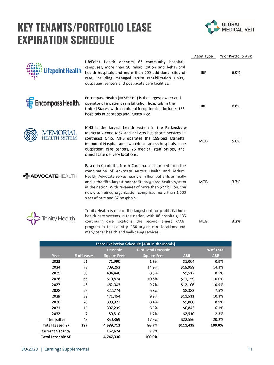 3Q - 2023 | Earnings Supplemental 10 PORTFOLIO SUMMARY (as of September 30, 2023) Mercy Rehab Hospital – Oklahoma City, OK MOB 70% IRF 18% Surgical Hospital 4% Other 8% BUILDING TYPE BY ABR TX 18% FL 10% OH 8% PA 7% AZ 6% IL 6% All Others 45% LOCATION BY ABR Multi - Speciality 37% IRF 18% Opthamology 7% Oncology 4% Gastro 4% All Others 30% SPECIALTY BY ABR Health System 35% Physician Clinic 32% Post - Acute Care 21% Physician Surgical 7% All Others 5% PROVIDER TYPE BY ABR