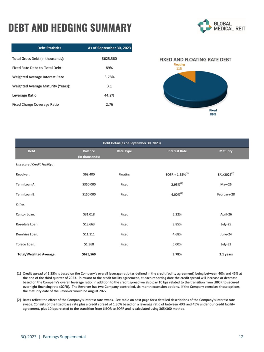 3Q - 2023 | Earnings Supplemental 12 DEBT AND HEDGING SUMMARY (1) Credit spread of 1.35% is based on the Company’s overall leverage ratio (as defined in the credit facility agreement) being b etw een 40% and 45% at the end of the third quarter of 2023. Pursuant to the credit facility agreement, at each reporting date the credit spread wi ll increase or decrease based on the Company’s overall leverage ratio. In addition to the credit spread we also pay 10 bps related to the transition fro m LIBOR to secured overnight financing rate (SOFR). The Revolver has two Company - controlled, six - month extension options. If the Company exercise s those options, the maturity date of the Revolver would be August 2027. (2) Rates reflect the effect of the Company’s interest rate swaps. See table on next page for a detailed descriptions of the Com pan y’s interest rate swaps. Consists of the fixed base rate plus a credit spread of 1.30% based on a leverage ratio of between 40% and 45 % under our credit facility agreement, plus 10 bps related to the transition from LIBOR to SOFR and is calculated using 365/360 method. Debt Balance Rate Type Interest Rate Maturity (in thousands) Unsecured Credit Facility: Revolver: $68,400 Floating SOFR + 1.35% (1) 8/1/2026 (1) Term Loan A: $350,000 Fixed 2.95% (2) May-26 Term Loan B: $150,000 Fixed 4.00% (2) February-28 Other: Cantor Loan: $31,018 Fixed 5.22% April-26 Rosedale Loan: $13,663 Fixed 3.85% July-25 Dumfries Loan: $11,111 Fixed 4.68% June-24 Toledo Loan: $1,368 Fixed 5.00% July-33 Total/Weighted Average: $625,560 3.78% 3.1 years Debt Detail (as of September 30, 2023) Fixed 89% Floating 11% FIXED AND FLOATING RATE DEBT Debt Statistics As of September 30, 2023 Total Gross Debt (in thousands): $625,560 Fixed Rate Debt-to-Total Debt: 89% Weighted Average Interest Rate 3.78% Weighted Average Maturity (Years): 3.1 Leverage Ratio 44.2% Fixed Charge Coverage Ratio 2.76