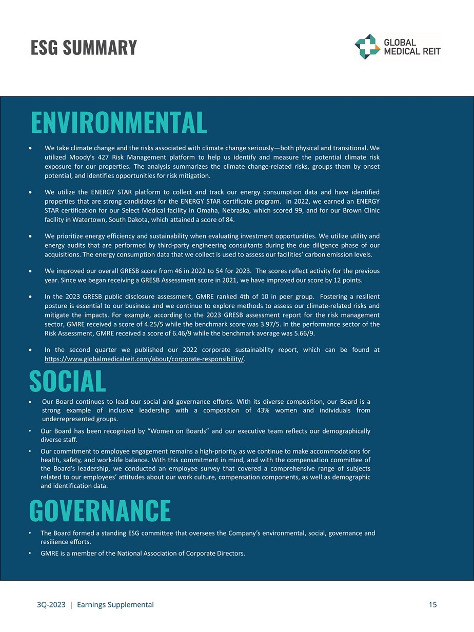 3Q - 2023 | Earnings Supplemental 15 ESG SUMMARY We take climate change and the risks associated with climate change seriously — both physical and transitional . We utilized Moody’s 427 Risk Management platform to help us identify and measure the potential climate risk exposure for our properties . The analysis summarizes the climate change - related risks, groups them by onset potential, and identifies opportunities for risk mitigation . We utilize the ENERGY STAR platform to collect and track our energy consumption data and have identified properties that are strong candidates for the ENERGY STAR certificate program . In 2022 , we earned an ENERGY STAR certification for our Select Medical facility in Omaha, Nebraska, which scored 99 , and for our Brown Clinic facility in Watertown, South Dakota, which attained a score of 84 . We prioritize energy efficiency and sustainability when evaluating investment opportunities . We utilize utility and energy audits that are performed by third - party engineering consultants during the due diligence phase of our acquisitions . The energy consumption data that we collect is used to assess our facilities’ carbon emission levels . We improved our overall GRESB score from 46 in 2022 to 54 for 2023 . The scores reflect activity for the previous year . Since we began receiving a GRESB Assessment score in 2021 , we have improved our score by 12 points . In the 2023 GRESB public disclosure assessment, GMRE ranked 4 th of 10 in peer group . Fostering a resilient posture is essential to our business and we continue to explore methods to assess our climate - related risks and mitigate the impacts . For example, according to the 2023 GRESB assessment report for the risk management sector, GMRE received a score of 4 . 25 / 5 while the benchmark score was 3 . 97 / 5 . In the performance sector of the Risk Assessment, GMRE received a score of 6 . 46 / 9 while the benchmark average was 5 . 66 / 9 . In the second quarter we published our 2022 corporate sustainability report, which can be found at https : //www . globalmedicalreit . com/about/corporate - responsibility/ . ENVIRONMENTAL SOCIAL Our Board continues to lead our social and governance efforts . With its diverse composition, our Board is a strong example of inclusive leadership with a composition of 43 % women and individuals from underrepresented groups . • Our Board has been recognized by “Women on Boards” and our executive team reflects our demographically diverse staff . • Our commitment to employee engagement remains a high - priority, as we continue to make accommodations for health, safety, and work - life balance . With this commitment in mind, and with the compensation committee of the Board’s leadership, we conducted an employee survey that covered a comprehensive range of subjects related to our employees’ attitudes about our work culture, compensation components, as well as demographic and identification data . GOVERNANCE • The Board formed a standing ESG committee that oversees the Company’s environmental, social, governance and resilience efforts . • GMRE is a member of the National Association of Corporate Directors .