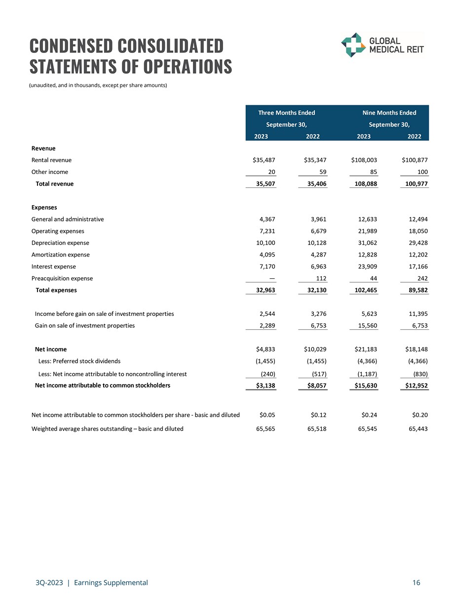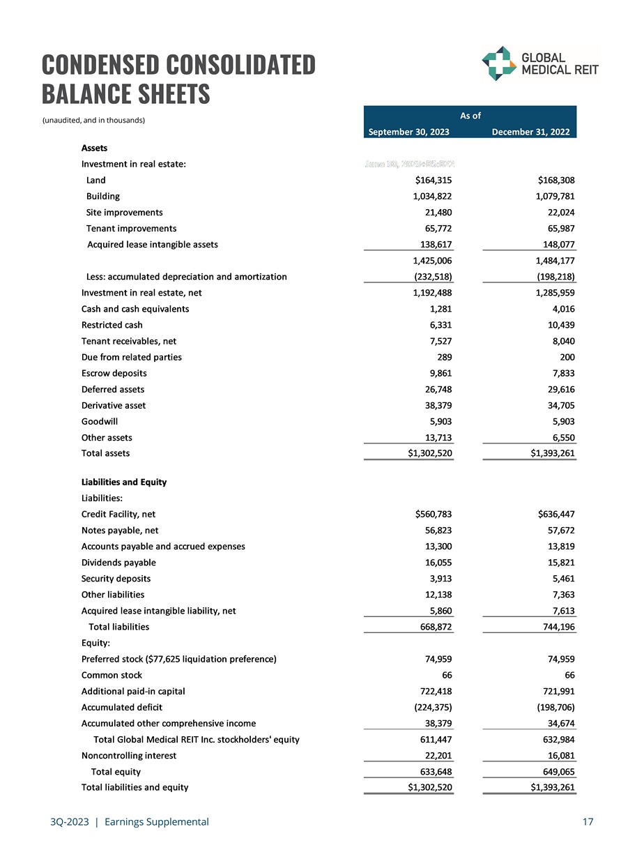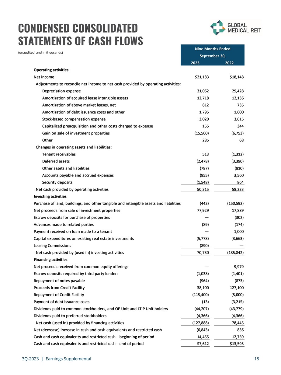 3Q - 2023 | Earnings Supplemental 17 CONDENSED CONSOLIDATED BALANCE SHEETS (unaudited, and in thousands) September 30, 2023 December 31, 2022 Assets Investment in real estate: June 30, 2023+B5:B22 Land $164,315 $168,308 Building 1,034,822 1,079,781 Site improvements 21,480 22,024 Tenant improvements 65,772 65,987 Acquired lease intangible assets 138,617 148,077 1,425,006 1,484,177 Less: accumulated depreciation and amortization (232,518) (198,218) Investment in real estate, net 1,192,488 1,285,959 Cash and cash equivalents 1,281 4,016 Restricted cash 6,331 10,439 Tenant receivables, net 7,527 8,040 Due from related parties 289 200 Escrow deposits 9,861 7,833 Deferred assets 26,748 29,616 Derivative asset 38,379 34,705 Goodwill 5,903 5,903 Other assets 13,713 6,550 Total assets $1,302,520 $1,393,261 Liabilities and Equity Liabilities: Credit Facility, net $560,783 $636,447 Notes payable, net 56,823 57,672 Accounts payable and accrued expenses 13,300 13,819 Dividends payable 16,055 15,821 Security deposits 3,913 5,461 Other liabilities 12,138 7,363 Acquired lease intangible liability, net 5,860 7,613 Total liabilities 668,872 744,196 Equity: Preferred stock ($77,625 liquidation preference) 74,959 74,959 Common stock 66 66 Additional paid-in capital 722,418 721,991 Accumulated deficit (224,375) (198,706) Accumulated other comprehensive income 38,379 34,674 Total Global Medical REIT Inc. stockholders' equity 611,447 632,984 Noncontrolling interest 22,201 16,081 Total equity 633,648 649,065 Total liabilities and equity $1,302,520 $1,393,261 As of