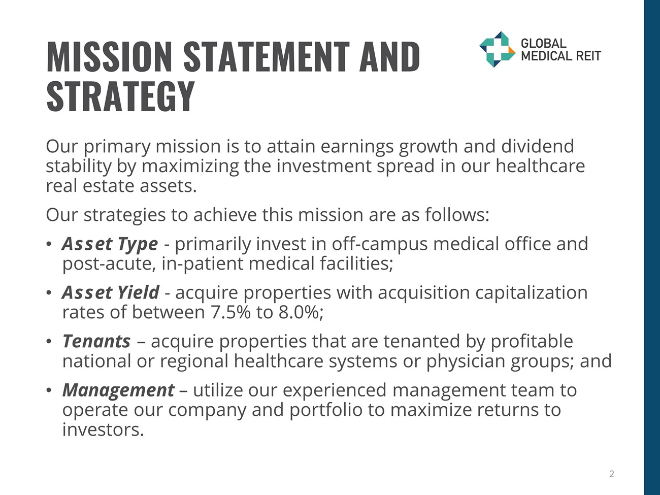 Our primary mission is to attain earnings growth and dividend stability by maximizing the investment spread in our healthcare real estate assets. Our strategies to achieve this mission are as follows: • Asset Type - primarily invest in off - campus medical office and post - acute, in - patient medical facilities; • Asset Yield - acquire properties with acquisition capitalization rates of between 7.5% to 8.0%; • Tenants – acquire properties that are tenanted by profitable national or regional healthcare systems or physician groups; and • Management – utilize our experienced management team to operate our company and portfolio to maximize returns to investors. 2 MISSION STATEMENT AND STRATEGY