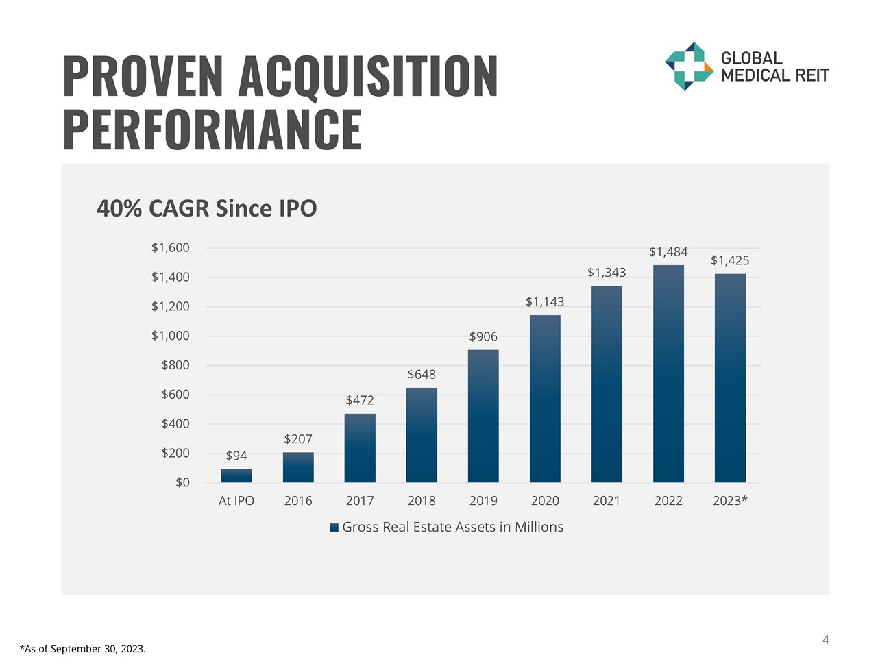 3 A STRATEGY THAT DELIVERS VALUE $1.4B Investments in Real Estate Gross $0.6B Market Cap* 7.9% Weighted Average Cap Rate 9.1% Dividend Yield* *Based on closing price of the Company’s common stock of $9.25 on November 10, 2023. All other data as of September 30, 202 3. Atrium Health – Winston - Salem, NC
