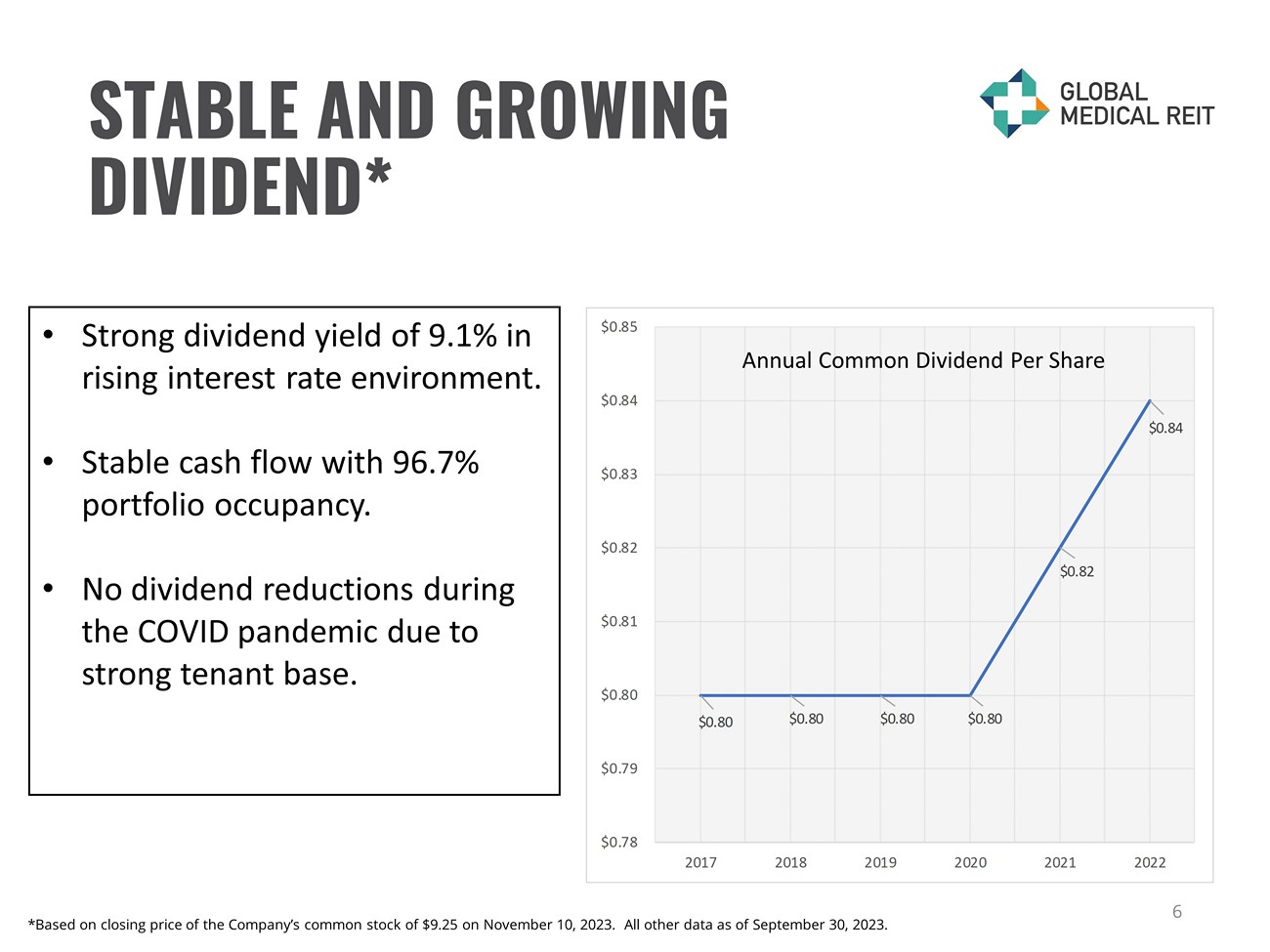 HIGH PERFORMING REAL ESTATE AT THE FOREFRONT OF HEALTHCARE 5 4.2X RENT COVERAGE 2.1% WEIGHTED AVERAGE RENT ESCALATIONS 5.7 WEIGHTED AVERAGE LEASE TERM 185 BUILDINGS 268 TENANTS 96.7% OCCUPANCY 4.7M Net Leasable Area (SF) (as of September 30, 2023) *Occupancy and asset type percentages are based on annualized base rent as of September 30, 2023. MOB 70% IRF 18% Other 8%