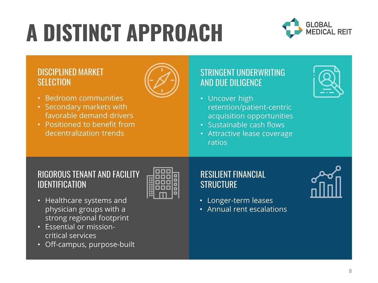 “With an attentive, flexible and creative approach, Global Medical REIT worked with us to structure a transaction that met our goals and helped propel our growth. GMRE has been a helpful partner and resource since our closing.” David Harano former CEO, Gastro One 12