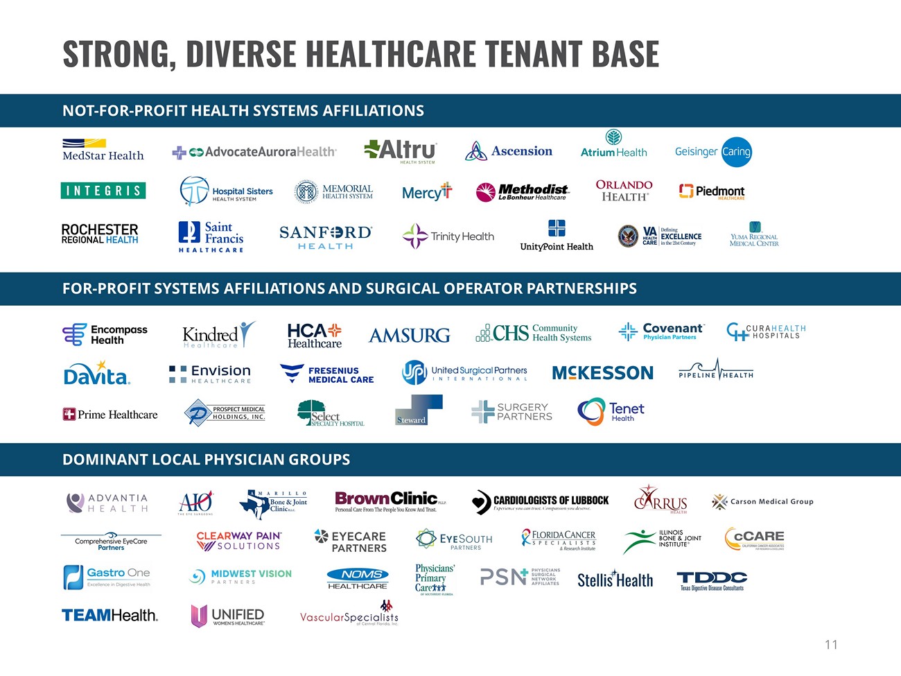 11 DOMINANT LOCAL PHYSICIAN GROUPS FOR - PROFIT SYSTEMS AFFILIATIONS AND SURGICAL OPERATOR PARTNERSHIPS STRONG, DIVERSE HEALTHCARE TENANT BASE NOT - FOR - PROFIT HEALTH SYSTEMS AFFILIATIONS
