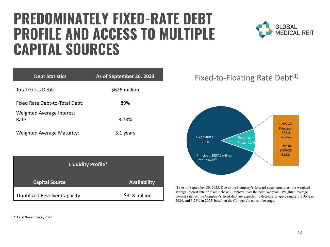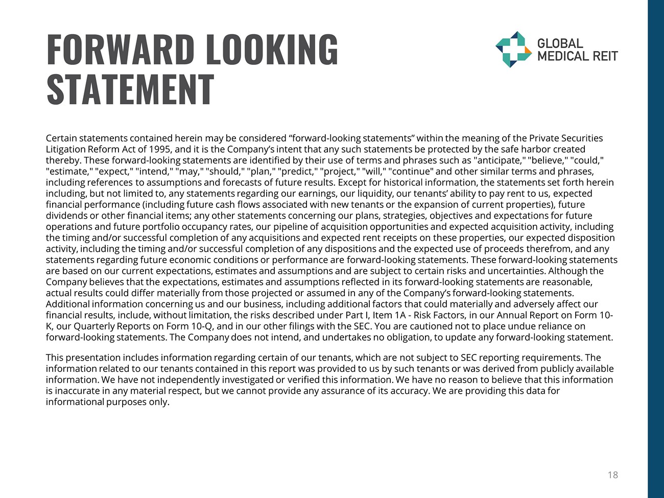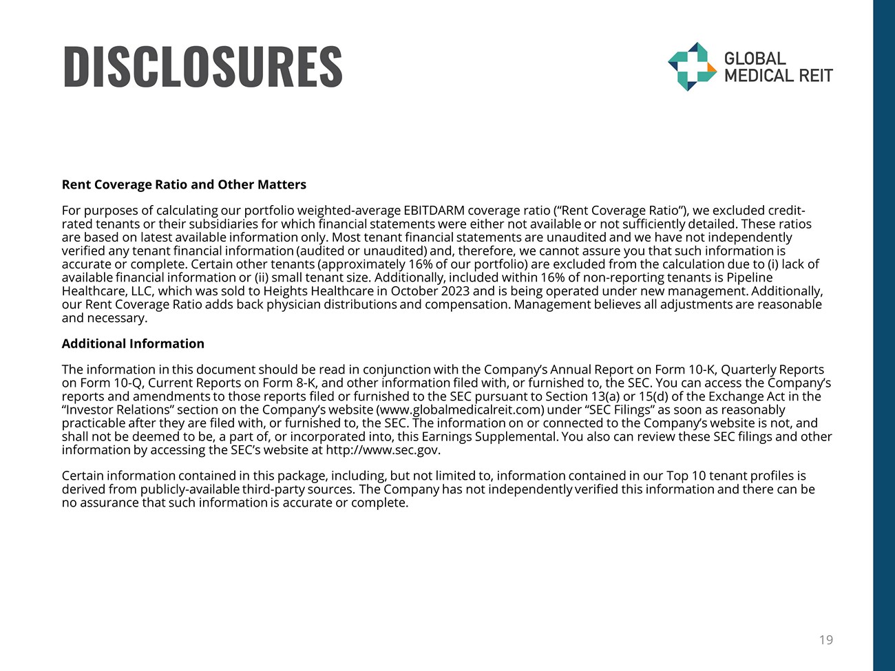DISCLOSURES Rent Coverage Ratio and Other Matters For purposes of calculating our portfolio weighted - average EBITDARM coverage ratio (“Rent Coverage Ratio”), we excluded credit - rated tenants or their subsidiaries for which financial statements were either not available or not sufficiently detailed. Th ese ratios are based on latest available information only. Most tenant financial statements are unaudited and we have not independently verified any tenant financial information (audited or unaudited) and, therefore, we cannot assure you that such information i s accurate or complete. Certain other tenants (approximately 16% of our portfolio) are excluded from the calculation due to ( i ) lack of available financial information or (ii) small tenant size. Additionally, included within 16% of non - reporting tenants is Pipelin e Healthcare, LLC, which was sold to Heights Healthcare in October 2023 and is being operated under new management. Additionall y, our Rent Coverage Ratio adds back physician distributions and compensation. Management believes all adjustments are reasonabl e and necessary. Additional Information The information in this document should be read in conjunction with the Company’s Annual Report on Form 10 - K, Quarterly Reports on Form 10 - Q, Current Reports on Form 8 - K, and other information filed with, or furnished to, the SEC. You can access the Compan y’s reports and amendments to those reports filed or furnished to the SEC pursuant to Section 13(a) or 15(d) of the Exchange Act in the “Investor Relations” section on the Company’s website (www.globalmedicalreit.com) under “SEC Filings” as soon as reasonably practicable after they are filed with, or furnished to, the SEC. The information on or connected to the Company’s website is not , and shall not be deemed to be, a part of, or incorporated into, this Earnings Supplemental. You also can review these SEC filings an d other information by accessing the SEC’s website at http://www.sec.gov. Certain information contained in this package, including, but not limited to, information contained in our Top 10 tenant prof ile s is derived from publicly - available third - party sources. The Company has not independently verified this information and there can b e no assurance that such information is accurate or complete. 19