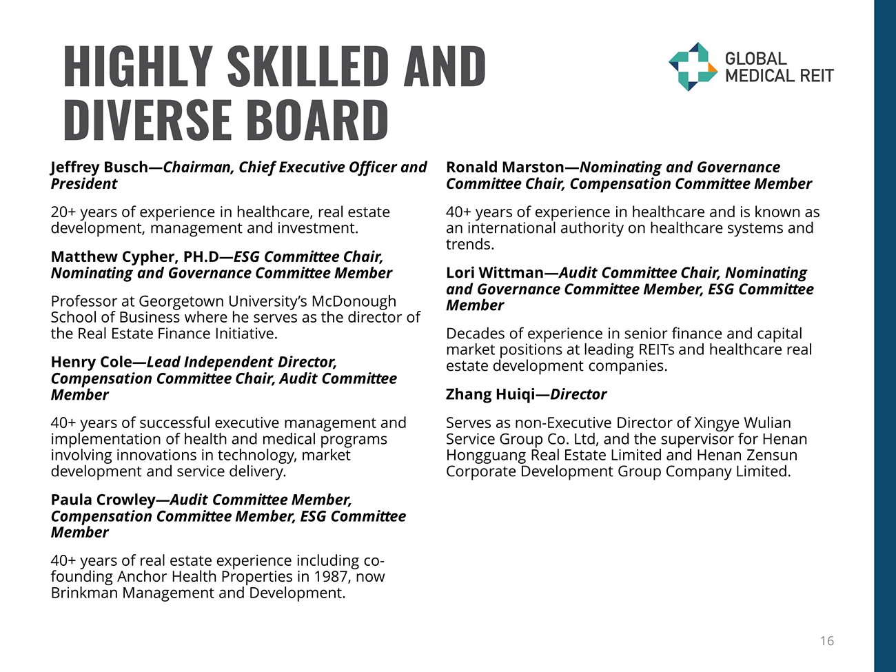 HIGHLY SKILLED AND DIVERSE BOARD 16 Jeffrey Busch — Chairman, Chief Executive Officer and President 20+ years of experience in healthcare, real estate development, management and investment. Matthew Cypher, PH.D — ESG Committee Chair, Nominating and Governance Committee Member Professor at Georgetown University’s McDonough School of Business where he serves as the director of the Real Estate Finance Initiative. Henry Cole — Lead Independent Director, Compensation Committee Chair, Audit Committee Member 40+ years of successful executive management and implementation of health and medical programs involving innovations in technology, market development and service delivery. Paula Crowley — Audit Committee Member, Compensation Committee Member, ESG Committee Member 40+ years of real estate experience including co - founding Anchor Health Properties in 1987, now Brinkman Management and Development. Ronald Marston — Nominating and Governance Committee Chair, Compensation Committee Member 40+ years of experience in healthcare and is known as an international authority on healthcare systems and trends. Lori Wittman — Audit Committee Chair, Nominating and Governance Committee Member, ESG Committee Member Decades of experience in senior finance and capital market positions at leading REITs and healthcare real estate development companies. Zhang Huiqi — Director Serves as non - Executive Director of Xingye Wulian Service Group Co. Ltd, and the supervisor for Henan Hongguang Real Estate Limited and Henan Zensun Corporate Development Group Company Limited.