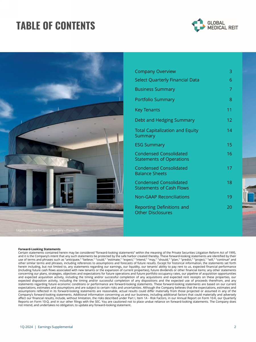 Forward - Looking Statements Certain statements contained herein may be considered “forward - looking statements” within the meaning of the Private Securities Litigation Reform Act of 1995 , and it is the Company’s intent that any such statements be protected by the safe harbor created thereby . These forward - looking statements are identified by their use of terms and phrases such as "anticipate," "believe," "could," "estimate," "expect," "intend," "may," "should," "plan," "predict," "project," "will," "continue" and other similar terms and phrases, including references to assumptions and forecasts of future results . Except for historical information, the statements set forth herein including, but not limited to, any statements regarding our earnings, our liquidity, our tenants’ ability to pay rent to us, expected financial performance (including future cash flows associated with new tenants or the expansion of current properties), future dividends or other financial items ; any other statements concerning our plans, strategies, objectives and expectations for future operations and future portfolio occupancy rates, our pipeline of acquisition opportunities and expected acquisition activity, including the timing and/or successful completion of any acquisitions and expected rent receipts on these properties, our expected disposition activity, including the timing and/or successful completion of any dispositions and the expected use of proceeds therefrom, and any statements regarding future economic conditions or performance are forward - looking statements . These forward - looking statements are based on our current expectations, estimates and assumptions and are subject to certain risks and uncertainties . Although the Company believes that the expectations, estimates and assumptions reflected in its forward - looking statements are reasonable, actual results could differ materially from those projected or assumed in any of the Company’s forward - looking statements . Additional information concerning us and our business, including additional factors that could materially and adversely affect our financial results, include, without limitation, the risks described under Part I, Item 1 A - Risk Factors, in our Annual Report on Form 10 - K, our Quarterly Reports on Form 10 - Q, and in our other filings with the SEC . You are cautioned not to place undue reliance on forward - looking statements . The Company does not intend, and undertakes no obligation, to update any forward - looking statement . TABLE OF CONTENTS Company Overview 3 Select Quarterly Financial Data 6 Business Summary 7 Portfolio Summary 8 Key Tenants 11 Debt and Hedging Summary 12 Total Capitalization and Equity Summary 14 ESG Summary 15 Condensed Consolidated Statements of Operations 16 Condensed Consolidated Balance Sheets 17 Condensed Consolidated Statements of Cash Flows 18 Non - GAAP Reconciliations 19 Reporting Definitions and Other Disclosures 20 Legent Hospital for Special Surgery – Plano, TX 1Q - 2024 | Earnings Supplemental 2