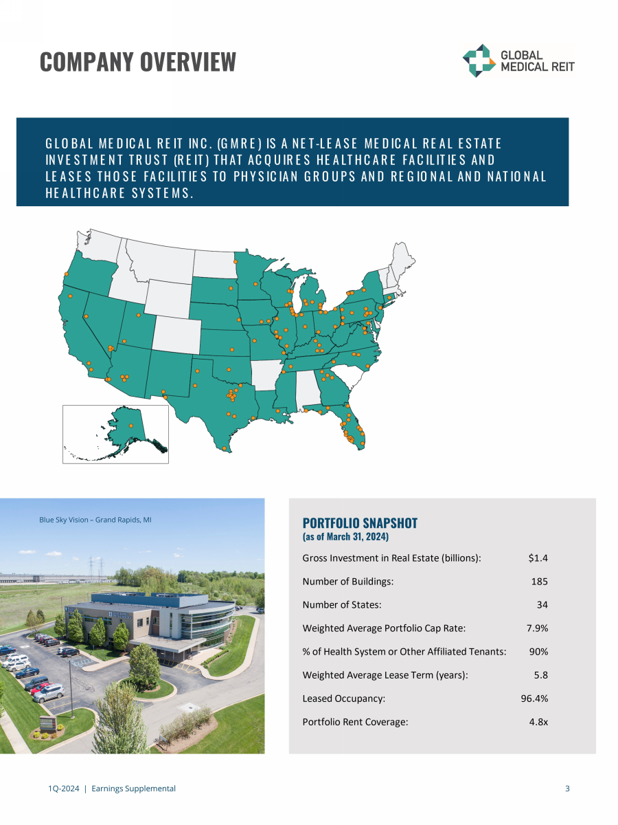 3 1Q - 2024 | Earnings Supplemental COMPANY OVERVIEW GLOBAL MEDICAL REIT INC. (GMRE) IS A NET - LEASE MEDICAL REAL ESTATE INVESTMENT TRUST (REIT) THAT ACQUIRES HEALTHCARE FACILITIES AND LEASES THOSE FACILITIES TO PHYSICIAN GROUPS AND REGIONAL AND NATIONAL HEALTHCARE SYSTEMS. PORTFOLIO SNAPSHOT (as of March 31, 2024) Blue Sky Vision – Grand Rapids, MI Gross Investment in Real Estate (billions): $1.4 Number of Buildings: 185 Number of States: 34 Weighted Average Portfolio Cap Rate: 7.9% % of Health System or Other Affiliated Tenants: 90% Weighted Average Lease Term (years): 5.8 Leased Occupancy: 96.4% Portfolio Rent Coverage: 4.8x