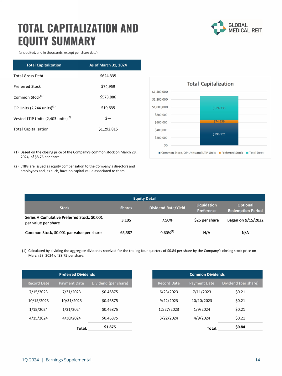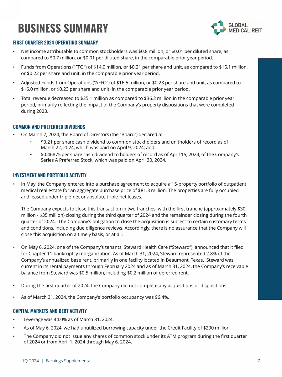 1Q - 2024 | Earnings Supplemental 7 BUSINESS SUMMARY FIRST QUARTER 2024 OPERATING SUMMARY • Net income attributable to common stockholders was $0.8 million, or $0.01 per diluted share, as compared to $0.7 million, or $0.01 per diluted share, in the comparable prior year period. • Funds from Operations (“FFO”) of $14.9 million, or $0.21 per share and unit, as compared to $15.1 million, or $0.22 per share and unit, in the comparable prior year period. • Adjusted Funds from Operations (“AFFO”) of $16.5 million, or $0.23 per share and unit, as compared to $16.0 million, or $0.23 per share and unit, in the comparable prior year period. • Total revenue decreased to $35.1 million as compared to $36.2 million in the comparable prior year period, primarily reflecting the impact of the Company’s property dispositions that were completed during 2023. COMMON AND PREFERRED DIVIDENDS • On March 7, 2024, the Board of Directors (the “Board”) declared a: • $0.21 per share cash dividend to common stockholders and unitholders of record as of March 22, 2024, which was paid on April 9, 2024; and • $0.46875 per share cash dividend to holders of record as of April 15, 2024, of the Company’s Series A Preferred Stock, which was paid on April 30, 2024. INVESTMENT AND PORTFOLIO ACTIVITY • In May, the Company entered into a purchase agreement to acquire a 15 - property portfolio of outpatient medical real estate for an aggregate purchase price of $81.3 million. The properties are fully occupied and leased under triple - net or absolute triple - net leases. The Company expects to close this transaction in two tranches, with the first tranche (approximately $30 million - $35 million) closing during the third quarter of 2024 and the remainder closing during the fourth quarter of 2024. The Company’s obligation to close the acquisition is subject to certain customary terms and conditions, including due diligence reviews. Accordingly, there is no assurance that the Company will close this acquisition on a timely basis, or at all. • On May 6, 2024, one of the Company’s tenants, Steward Health Care (“Steward”), announced that it filed for Chapter 11 bankruptcy reorganization. As of March 31, 2024, Steward represented 2.8% of the Company’s annualized base rent, primarily in one facility located in Beaumont, Texas. Steward was current in its rental payments through February 2024 and as of March 31, 2024, the Company’s receivable balance from Steward was $0.5 million, including $0.2 million of deferred rent. • During the first quarter of 2024, the Company did not complete any acquisitions or dispositions. • As of March 31, 2024, the Company’s portfolio occupancy was 96.4%. CAPITAL MARKETS AND DEBT ACTIVITY • Leverage was 44.0 % as of March 31, 2024. • As of May 6, 2024, we had unutilized borrowing capacity under the Credit Facility of $290 million. • The Company did not issue any shares of common stock under its ATM program during the first quarter of 2024 or from April 1, 2024 through May 6, 2024.