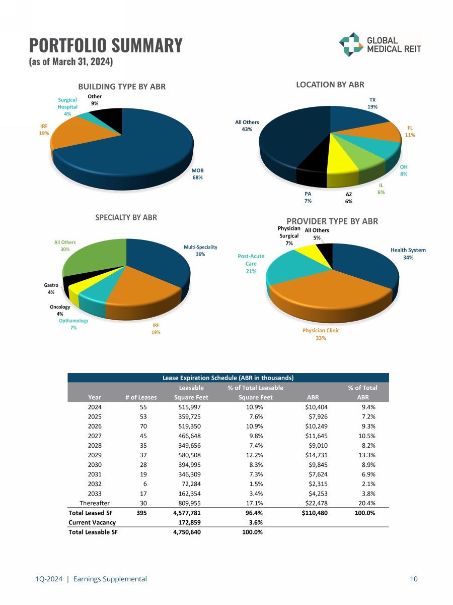 1Q - 2024 | Earnings Supplemental * See page 21 for disclosures regarding the Company’s rent coverage calculation 9 PORTFOLIO SUMMARY (as of March 31, 2024) LEASE TYPE RENT COVERAGE* 1) Includes surgical hospitals, long - term acute care hospitals (LTACH) and behavioral hospitals. cCare – San Marcos, CA Hialeah Medical Plaza – Hialeah, FL % of ABR Triple-net 55% Absolute-net 37% Modified gross 6% Gross 2% Asset Type % of ABR Ratio MOB 14% 6.6x MOB/ASC 11% 5.0x Inpatient Rehab (IRF) 17% 3.6x Specialty Hospital (1) 6% 3.7x Total/Weighted Average 48% 4.8x Tenants Not Included Large/Credit Rated Tenants 31% N/A Not Reported 21% N/A