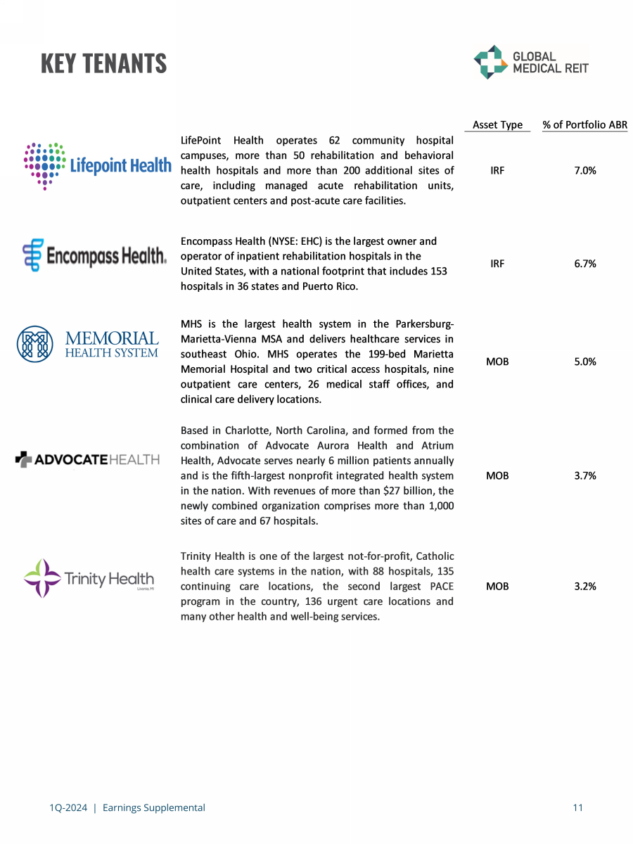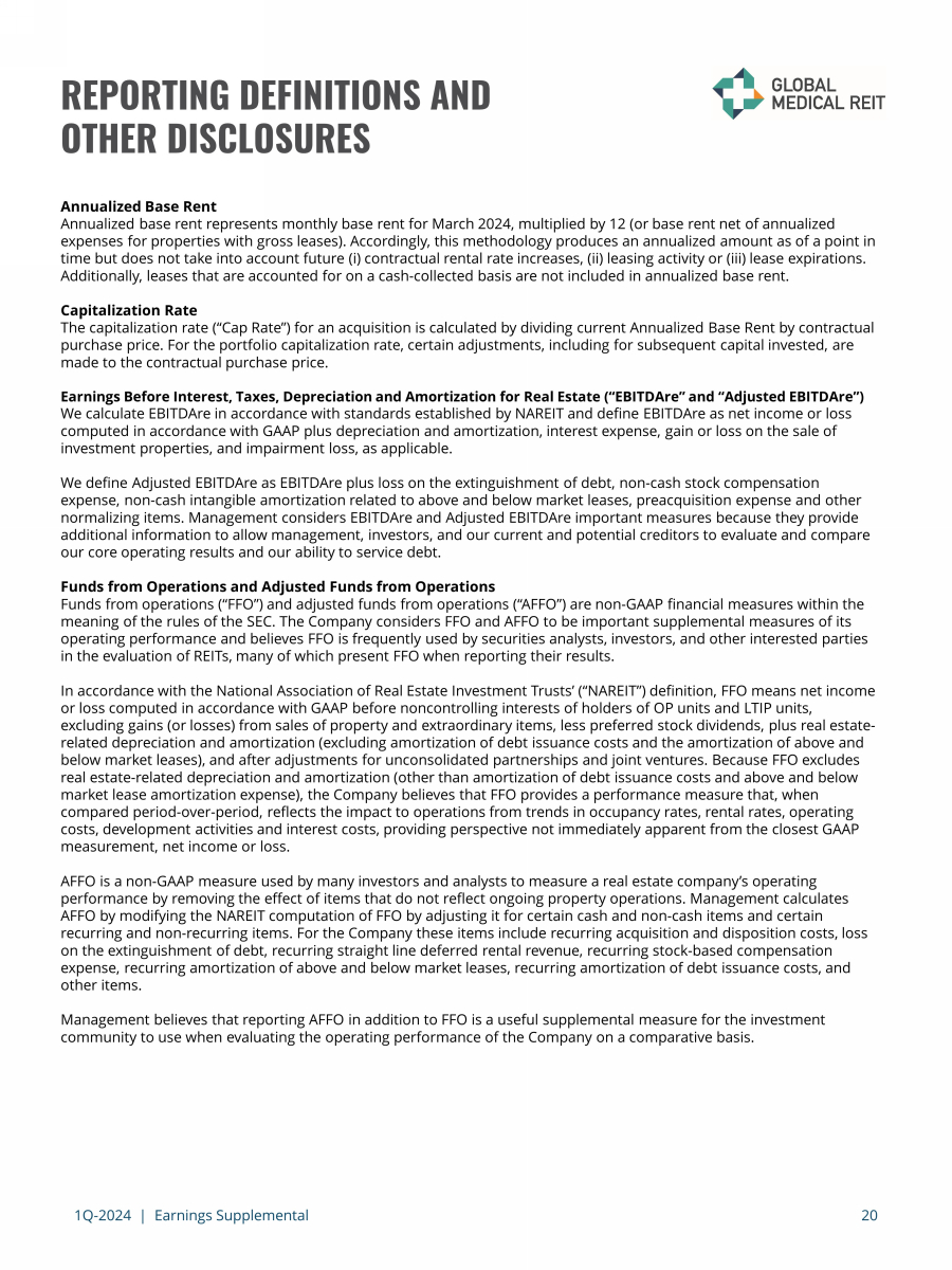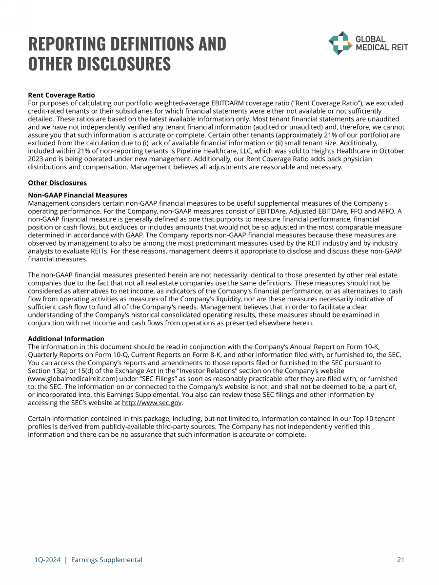 1Q - 2024 | Earnings Supplemental 21 REPORTING DEFINITIONS AND OTHER DISCLOSURES Rent Coverage Ratio For purposes of calculating our portfolio weighted - average EBITDARM coverage ratio (“Rent Coverage Ratio”), we excluded credit - rated tenants or their subsidiaries for which financial statements were either not available or not sufficiently detailed. These ratios are based on the latest available information only. Most tenant financial statements are unaudited and we have not independently verified any tenant financial information (audited or unaudited) and, therefore, we cannot assure you that such information is accurate or complete. Certain other tenants (approximately 21% of our portfolio) are excluded from the calculation due to (i) lack of available financial information or (ii) small tenant size. Additionally, included within 21% of non - reporting tenants is Pipeline Healthcare, LLC, which was sold to Heights Healthcare in October 2023 and is being operated under new management. Additionally, our Rent Coverage Ratio adds back physician distributions and compensation. Management believes all adjustments are reasonable and necessary. Other Disclosures Non - GAAP Financial Measures Management considers certain non - GAAP financial measures to be useful supplemental measures of the Company's operating performance. For the Company, non - GAAP measures consist of EBITDAre , Adjusted EBITDAre , FFO and AFFO. A non - GAAP financial measure is generally defined as one that purports to measure financial performance, financial position or cash flows, but excludes or includes amounts that would not be so adjusted in the most comparable measure determined in accordance with GAAP. The Company reports non - GAAP financial measures because these measures are observed by management to also be among the most predominant measures used by the REIT industry and by industry analysts to evaluate REITs. For these reasons, management deems it appropriate to disclose and discuss these non - GAAP financial measures. The non - GAAP financial measures presented herein are not necessarily identical to those presented by other real estate companies due to the fact that not all real estate companies use the same definitions. These measures should not be considered as alternatives to net income, as indicators of the Company's financial performance, or as alternatives to cash flow from operating activities as measures of the Company's liquidity, nor are these measures necessarily indicative of sufficient cash flow to fund all of the Company's needs. Management believes that in order to facilitate a clear understanding of the Company's historical consolidated operating results, these measures should be examined in conjunction with net income and cash flows from operations as presented elsewhere herein. Additional Information The information in this document should be read in conjunction with the Company’s Annual Report on Form 10 - K, Quarterly Reports on Form 10 - Q, Current Reports on Form 8 - K, and other information filed with, or furnished to, the SEC. You can access the Company’s reports and amendments to those reports filed or furnished to the SEC pursuant to Section 13(a) or 15(d) of the Exchange Act in the “Investor Relations” section on the Company’s website (www.globalmedicalreit.com) under “SEC Filings” as soon as reasonably practicable after they are filed with, or furnished to, the SEC. The information on or connected to the Company’s website is not, and shall not be deemed to be, a part of, or incorporated into, this Earnings Supplemental. You also can review these SEC filings and other information by accessing the SEC’s website at http://www.sec.gov . Certain information contained in this package, including, but not limited to, information contained in our Top 10 tenant profiles is derived from publicly - available third - party sources. The Company has not independently verified this information and there can be no assurance that such information is accurate or complete.