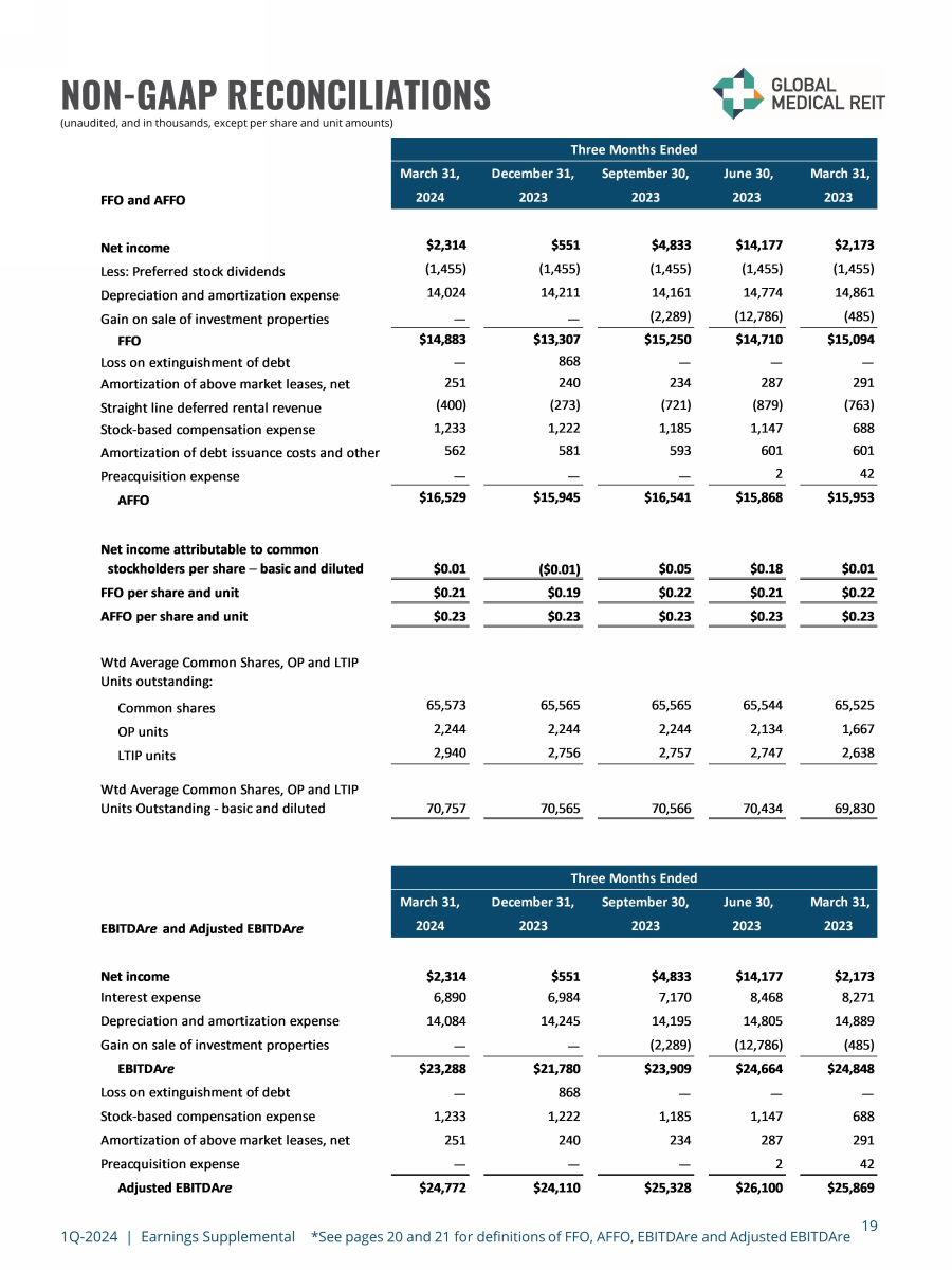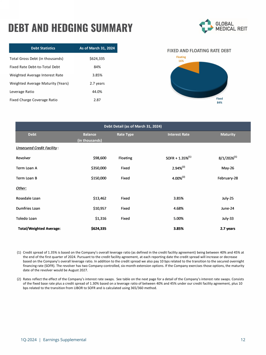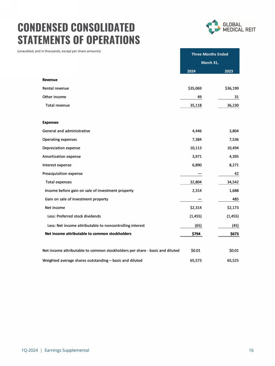 1Q - 2024 | Earnings Supplemental 21 REPORTING DEFINITIONS AND OTHER DISCLOSURES Rent Coverage Ratio For purposes of calculating our portfolio weighted - average EBITDARM coverage ratio (“Rent Coverage Ratio”), we excluded credit - rated tenants or their subsidiaries for which financial statements were either not available or not sufficiently detailed. These ratios are based on the latest available information only. Most tenant financial statements are unaudited and we have not independently verified any tenant financial information (audited or unaudited) and, therefore, we cannot assure you that such information is accurate or complete. Certain other tenants (approximately 21% of our portfolio) are excluded from the calculation due to (i) lack of available financial information or (ii) small tenant size. Additionally, included within 21% of non - reporting tenants is Pipeline Healthcare, LLC, which was sold to Heights Healthcare in October 2023 and is being operated under new management. Additionally, our Rent Coverage Ratio adds back physician distributions and compensation. Management believes all adjustments are reasonable and necessary. Other Disclosures Non - GAAP Financial Measures Management considers certain non - GAAP financial measures to be useful supplemental measures of the Company's operating performance. For the Company, non - GAAP measures consist of EBITDAre , Adjusted EBITDAre , FFO and AFFO. A non - GAAP financial measure is generally defined as one that purports to measure financial performance, financial position or cash flows, but excludes or includes amounts that would not be so adjusted in the most comparable measure determined in accordance with GAAP. The Company reports non - GAAP financial measures because these measures are observed by management to also be among the most predominant measures used by the REIT industry and by industry analysts to evaluate REITs. For these reasons, management deems it appropriate to disclose and discuss these non - GAAP financial measures. The non - GAAP financial measures presented herein are not necessarily identical to those presented by other real estate companies due to the fact that not all real estate companies use the same definitions. These measures should not be considered as alternatives to net income, as indicators of the Company's financial performance, or as alternatives to cash flow from operating activities as measures of the Company's liquidity, nor are these measures necessarily indicative of sufficient cash flow to fund all of the Company's needs. Management believes that in order to facilitate a clear understanding of the Company's historical consolidated operating results, these measures should be examined in conjunction with net income and cash flows from operations as presented elsewhere herein. Additional Information The information in this document should be read in conjunction with the Company’s Annual Report on Form 10 - K, Quarterly Reports on Form 10 - Q, Current Reports on Form 8 - K, and other information filed with, or furnished to, the SEC. You can access the Company’s reports and amendments to those reports filed or furnished to the SEC pursuant to Section 13(a) or 15(d) of the Exchange Act in the “Investor Relations” section on the Company’s website (www.globalmedicalreit.com) under “SEC Filings” as soon as reasonably practicable after they are filed with, or furnished to, the SEC. The information on or connected to the Company’s website is not, and shall not be deemed to be, a part of, or incorporated into, this Earnings Supplemental. You also can review these SEC filings and other information by accessing the SEC’s website at http://www.sec.gov . Certain information contained in this package, including, but not limited to, information contained in our Top 10 tenant profiles is derived from publicly - available third - party sources. The Company has not independently verified this information and there can be no assurance that such information is accurate or complete.