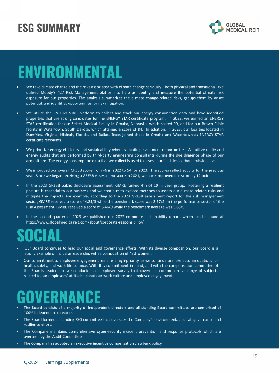 1Q - 2024 | Earnings Supplemental 15 ESG SUMMARY We take climate change and the risks associated with climate change seriously — both physical and transitional . We utilized Moody’s 427 Risk Management platform to help us identify and measure the potential climate risk exposure for our properties . The analysis summarizes the climate change - related risks, groups them by onset potential, and identifies opportunities for risk mitigation . We utilize the ENERGY STAR platform to collect and track our energy consumption data and have identified properties that are strong candidates for the ENERGY STAR certificate program . In 2022 , we earned an ENERGY STAR certification for our Select Medical facility in Omaha, Nebraska, which scored 99 , and for our Brown Clinic facility in Watertown, South Dakota, which attained a score of 84 . In addition, in 2023 , our facilities located in Dumfries, Virginia, Hialeah, Florida, and Dallas, Texas joined those in Omaha and Watertown as ENERGY STAR certificate recipients . . We prioritize energy efficiency and sustainability when evaluating investment opportunities . We utilize utility and energy audits that are performed by third - party engineering consultants during the due diligence phase of our acquisitions . The energy consumption data that we collect is used to assess our facilities’ carbon emission levels . We improved our overall GRESB score from 46 in 2022 to 54 for 2023 . The scores reflect activity for the previous year . Since we began receiving a GRESB Assessment score in 2021 , we have improved our score by 12 points . In the 2023 GRESB public disclosure assessment, GMRE ranked 4 th of 10 in peer group . Fostering a resilient posture is essential to our business and we continue to explore methods to assess our climate - related risks and mitigate the impacts . For example, according to the 2023 GRESB assessment report for the risk management sector, GMRE received a score of 4 . 25 / 5 while the benchmark score was 3 . 97 / 5 . In the performance sector of the Risk Assessment, GMRE received a score of 6 . 46 / 9 while the benchmark average was 5 . 66 / 9 . In the second quarter of 2023 we published our 2022 corporate sustainability report, which can be found at https : //www . globalmedicalreit . com/about/corporate - responsibility/ . ENVIRONMENTAL SOCIAL Our Board continues to lead our social and governance efforts . With its diverse composition, our Board is a strong example of inclusive leadership with a composition of 43 % women . • Our commitment to employee engagement remains a high - priority, as we continue to make accommodations for health, safety, and work - life balance . With this commitment in mind, and with the compensation committee of the Board’s leadership, we conducted an employee survey that covered a comprehensive range of subjects related to our employees’ attitudes about our work culture and employee engagement . GOVERNANCE • The Board consists of a majority of independent directors and all standing Board committees are comprised of 100 % independent directors . • The Board formed a standing ESG committee that oversees the Company’s environmental, social, governance and resilience efforts . • The Company maintains comprehensive cyber - security incident prevention and response protocols which are overseen by the Audit Committee . • The Company has adopted an executive incentive compensation clawback policy . • GMRE is a member of the National Association of Corporate Directors .