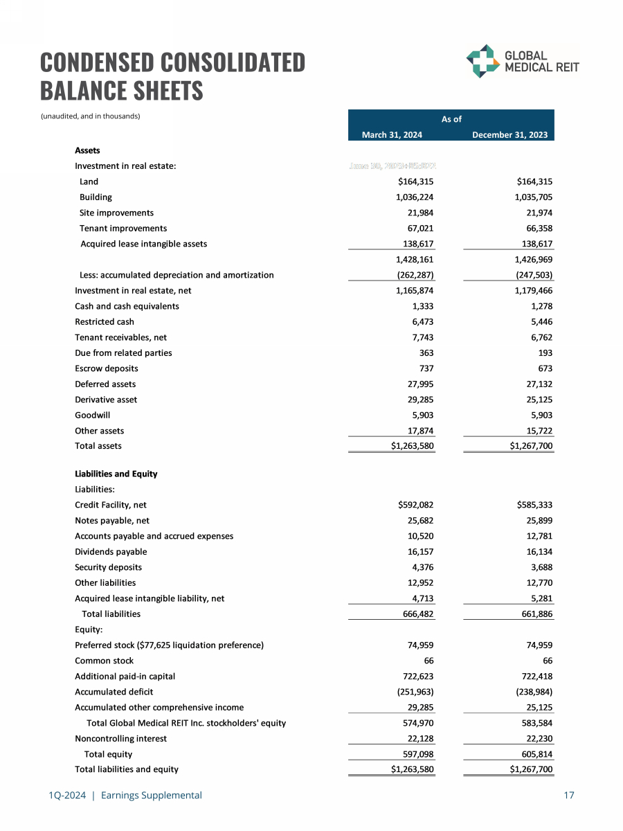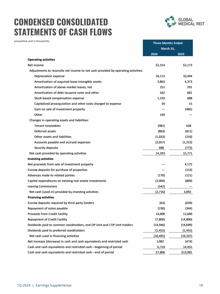 1Q - 2024 | Earnings Supplemental 17 CONDENSED CONSOLIDATED BALANCE SHEETS (unaudited, and in thousands) March 31, 2024 December 31, 2023 Assets Investment in real estate: June 30, 2023+B5:B22 Land $164,315 $164,315 Building 1,036,224 1,035,705 Site improvements 21,984 21,974 Tenant improvements 67,021 66,358 Acquired lease intangible assets 138,617 138,617 1,428,161 1,426,969 Less: accumulated depreciation and amortization (262,287) (247,503) Investment in real estate, net 1,165,874 1,179,466 Cash and cash equivalents 1,333 1,278 Restricted cash 6,473 5,446 Tenant receivables, net 7,743 6,762 Due from related parties 363 193 Escrow deposits 737 673 Deferred assets 27,995 27,132 Derivative asset 29,285 25,125 Goodwill 5,903 5,903 Other assets 17,874 15,722 Total assets $1,263,580 $1,267,700 Liabilities and Equity Liabilities: Credit Facility, net $592,082 $585,333 Notes payable, net 25,682 25,899 Accounts payable and accrued expenses 10,520 12,781 Dividends payable 16,157 16,134 Security deposits 4,376 3,688 Other liabilities 12,952 12,770 Acquired lease intangible liability, net 4,713 5,281 Total liabilities 666,482 661,886 Equity: Preferred stock ($77,625 liquidation preference) 74,959 74,959 Common stock 66 66 Additional paid-in capital 722,623 722,418 Accumulated deficit (251,963) (238,984) Accumulated other comprehensive income 29,285 25,125 Total Global Medical REIT Inc. stockholders' equity 574,970 583,584 Noncontrolling interest 22,128 22,230 Total equity 597,098 605,814 Total liabilities and equity $1,263,580 $1,267,700 As of